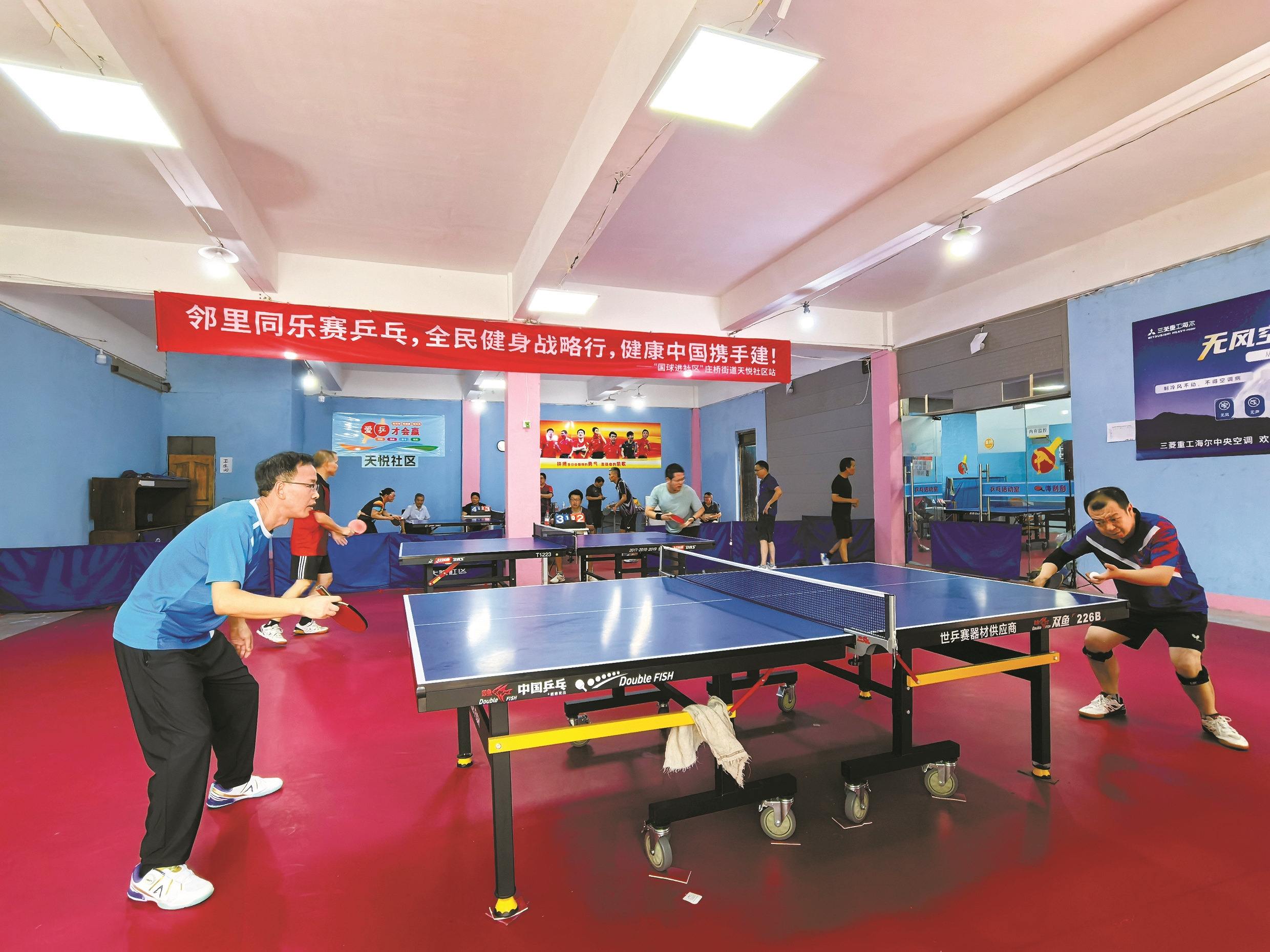 “社区出资1000元,其余的钱大多是‘软磨硬泡’换来的。”熊威笑着介绍,“一半的地胶、大部分球场挡板和其中一张球桌,都是专业球馆更新换代时,我们‘捡漏’搬回来的。”