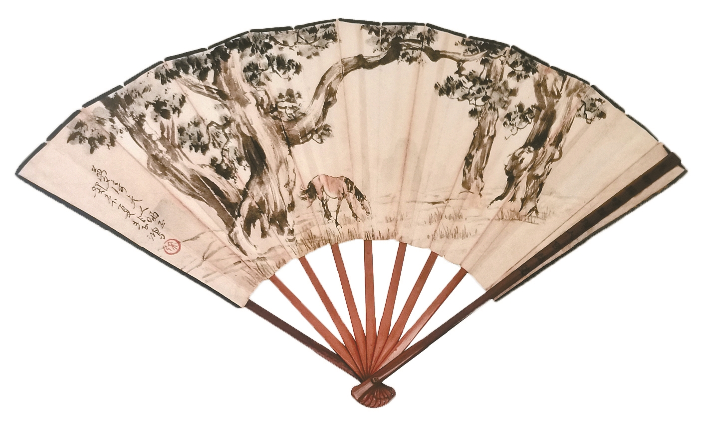 除近现代海上画派代表性书画家外,《中国成扇艺术》还介绍了一批近现代京津画派中有代表性的书画家,如徐悲鸿、陈师曾、溥儒、沈尹默、王雪涛、马晋、陈半丁、老舍、梅兰芳等。其中徐悲鸿《古柏放马图》成扇可圈可点。徐悲鸿以画马闻世,其扇画不多,此成扇绘画、书法均出自徐氏一人之手,为徐悲鸿1943年所作。金通达认为,“徐悲鸿画古柏大笔挥洒,葱茏郁勃,浓荫如盖;一骏马在柏树下憩息食草,神态矫健,形象生动。所作魏碑带草隶的笔法勾画出马的躯干、头部、四肢及鬃毛,寥寥数笔即表现出马的瞬间动态……全图笔墨精练,气势雄浑,动态传神,尽得生动雅逸之神韵。”