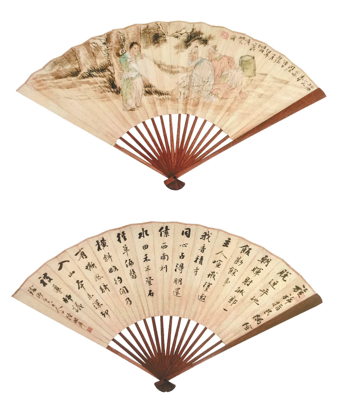 海派重要代表、晚清大师任伯年(1840年—1896年)《松荫赏画图》成扇,全副鸡翅木,设色金笺,用纸十分考究,该扇为任伯年1870年所作,为任氏早年人物精品成扇。金通达对此扇作了如此点评:“此作写坡地松荫之下,两位庞眉皓首、气宇轩昂的老者席地而坐,左边则有一书童展画于前;所画人物,纯以线描为之,造型准确,笔法酣畅传神,银钩铁画,力透纸背……”而此扇背面是清同治状元陆润庠(1841年—1915年)的行书,纸质泥金。陆氏行书取法“二王”,书风儒雅清朗,有平稳流美之韵味。