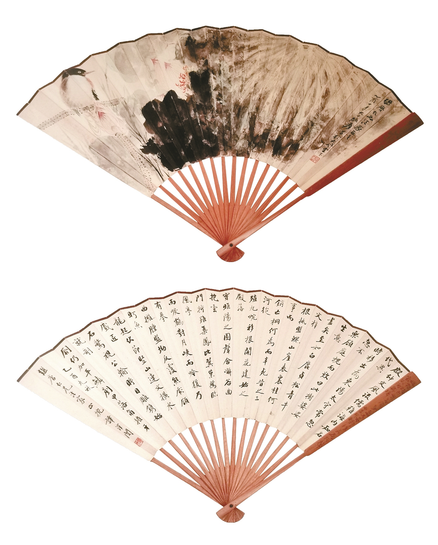 成扇之美,始于形制,成于匠心。扇面之中,书画与扇骨相映成趣,珠联璧合。一把小小的成扇,不仅能给读者带来扇子工艺、材质之美,更能欣赏到名家笔下的笔墨内涵。扇子虽小,但能小中见大,书画家于方寸之间的匠心布局,巧施墨彩,表现出空间之美,可谓“咫尺之间有乾坤”。
