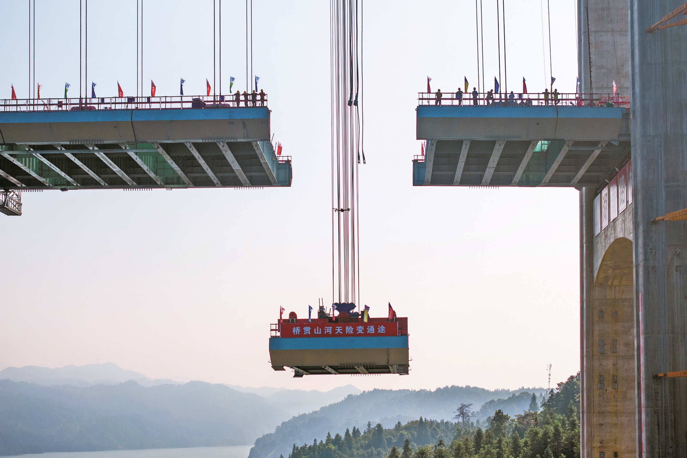 当日,随着最后一段200余吨重的钢混结合梁被缓缓提升,由湖南路桥建设集团承建的张官高速控制性工程洞庭溪沅水特大桥主桥顺利合龙,为2026年全线通车奠定了坚实基础。据了解,洞庭溪沅水特大桥位于湖南怀化市沅陵县境内,全长1707米,主桥长800米,为双塔单跨悬索桥。