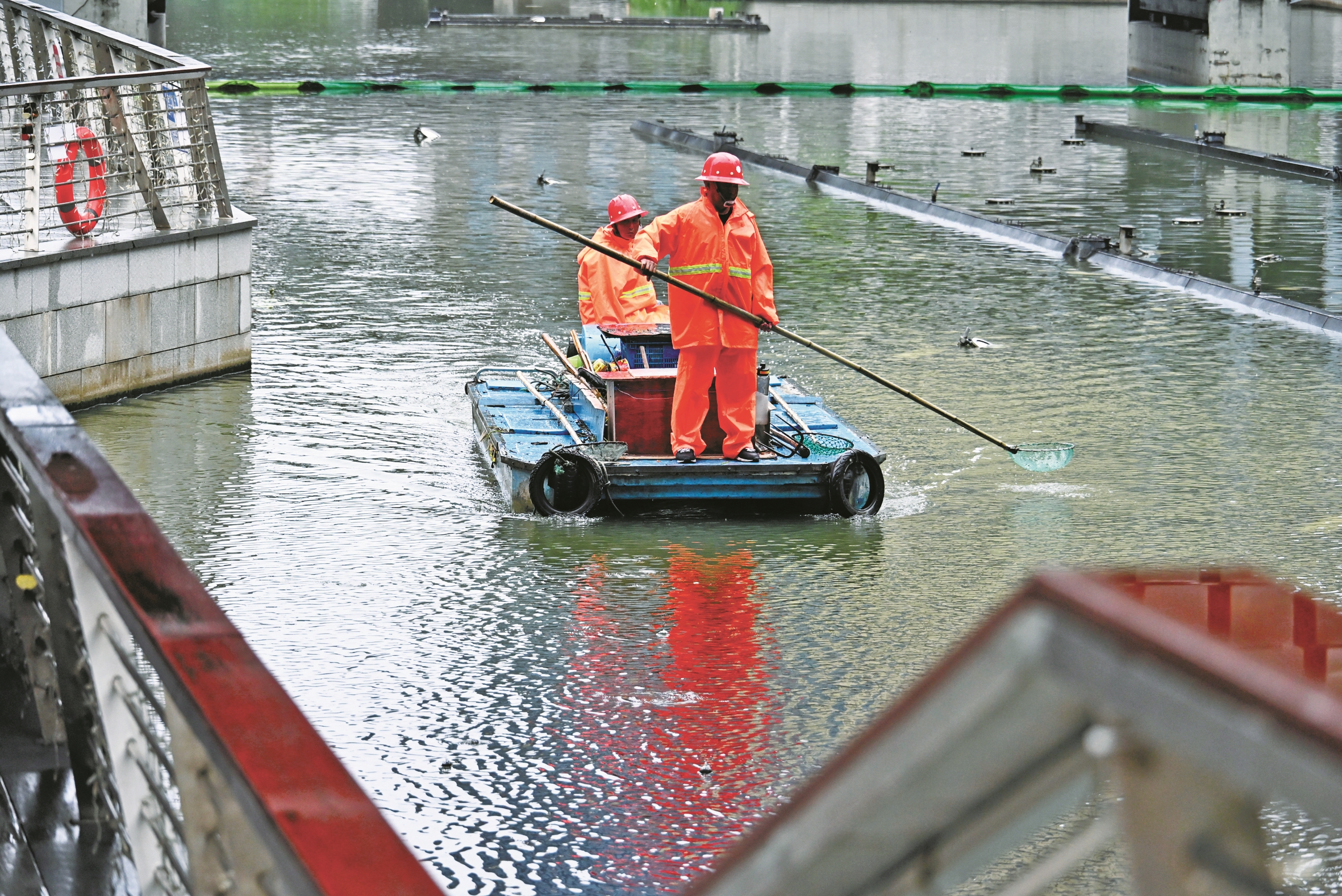 除了枯枝落叶,水草、浮萍、水葫芦也常来“报到”。夏季高温闷热,这些水生物繁殖得飞快,一旦清理不及时就会影响河道的水质、美观及船只畅通。