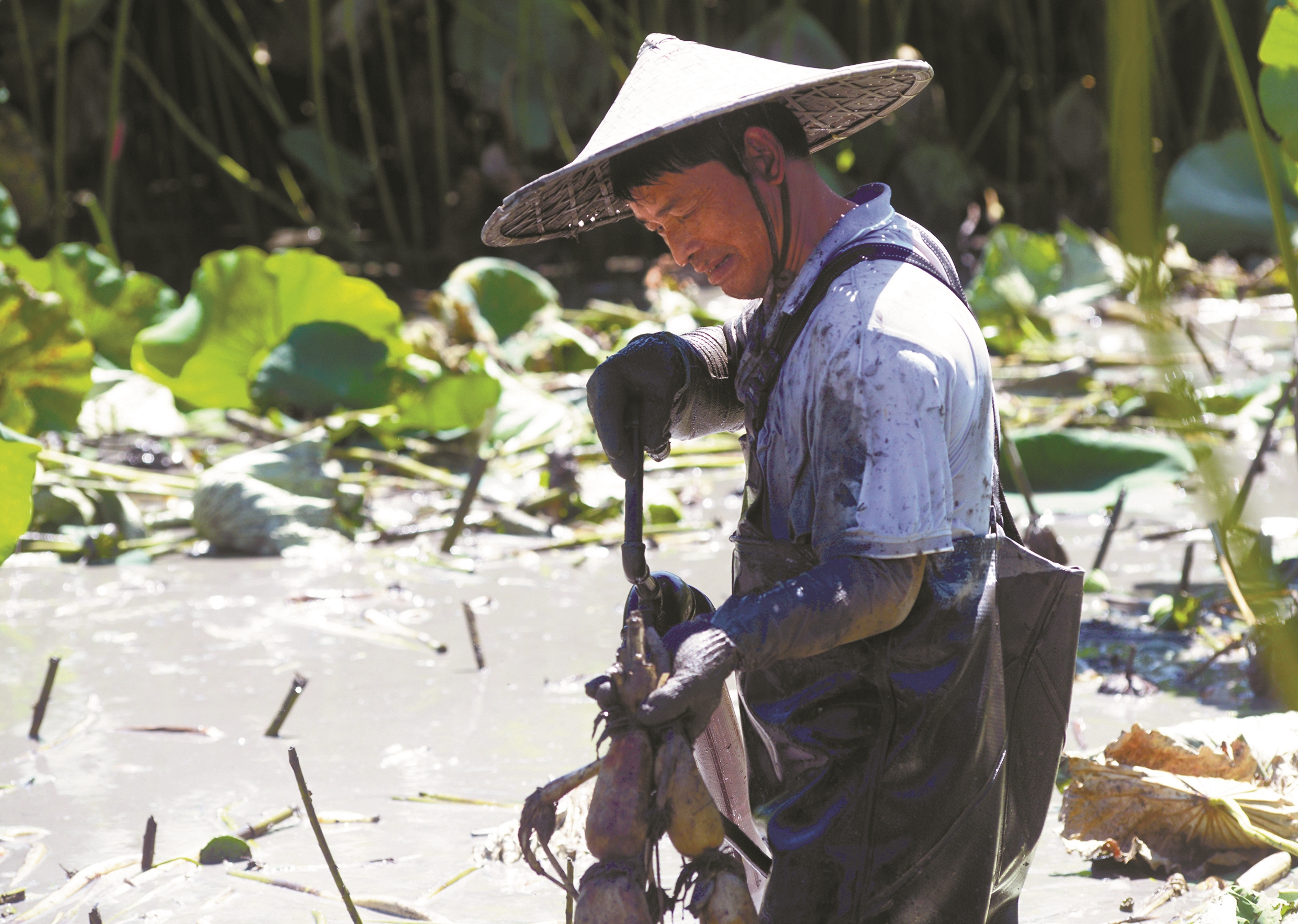 虽然眼下暑气正盛,但是张长良还是穿上厚重的防水裤、戴好橡胶手套干活。挖藕时,他的身上总是湿漉漉的。张长良解释,清晨,荷叶上挂满露珠,挖藕时要扒开荷叶,