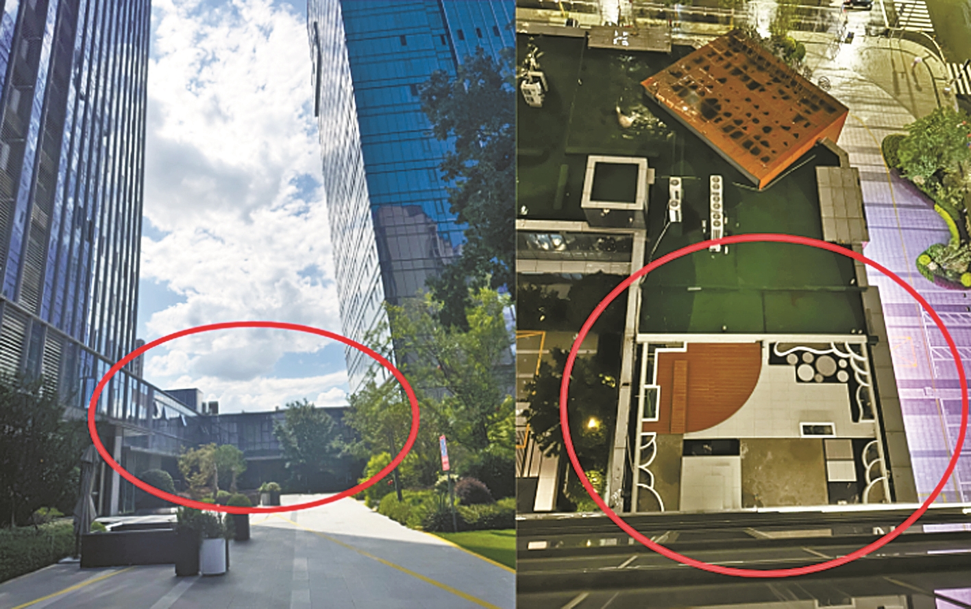 8月6日,记者前往现场。从小区高层住宅向下看去,12幢和13幢之间是一大片小区外围商铺的屋顶平台。平台上靠近13幢一侧,有块正方形区域被圈了起来,铺了瓷砖和地板,还设置了数个小花坛和景观造型。