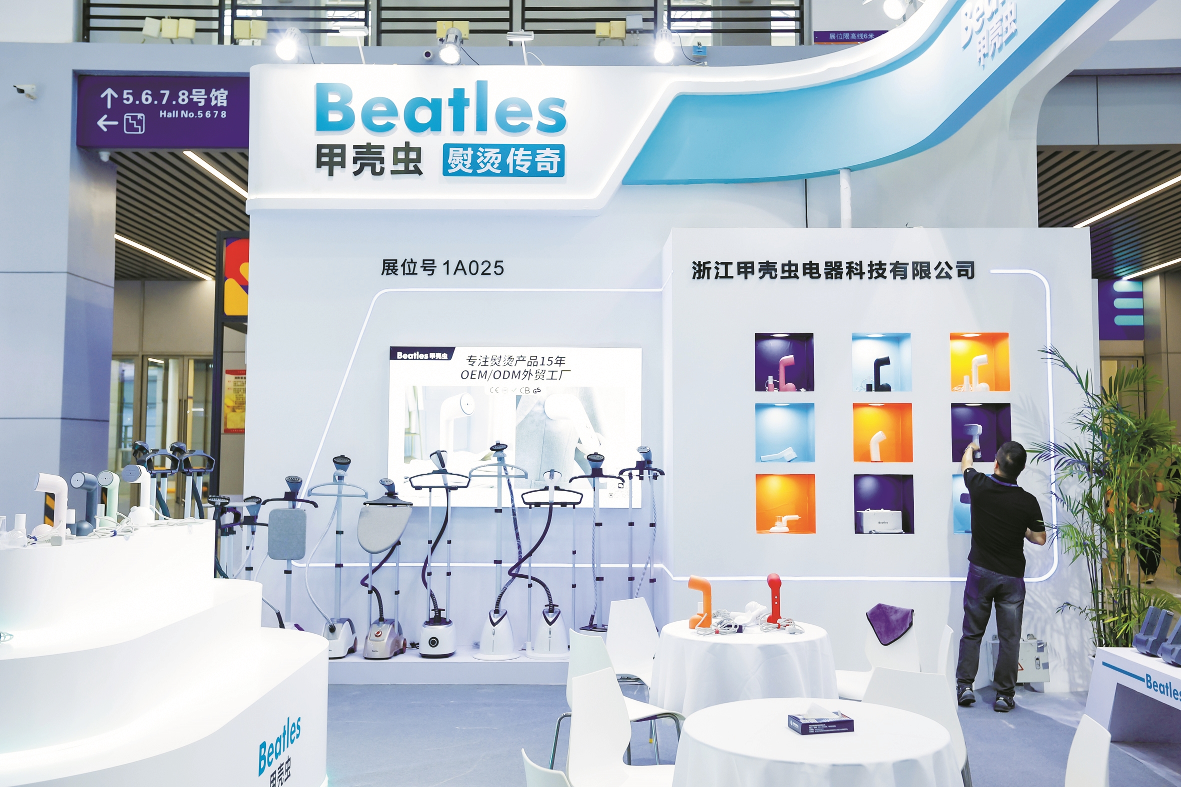 在浙江甲壳虫电器科技有限公司的展区,外贸部负责人李佳正在向客商详细地介绍新产品:“你看,这是我们的新产品,一体式的设计不仅更加美观,而且水箱能够扣在底部,使整个产品的重量更轻,即使长时间使用,也不会累。”