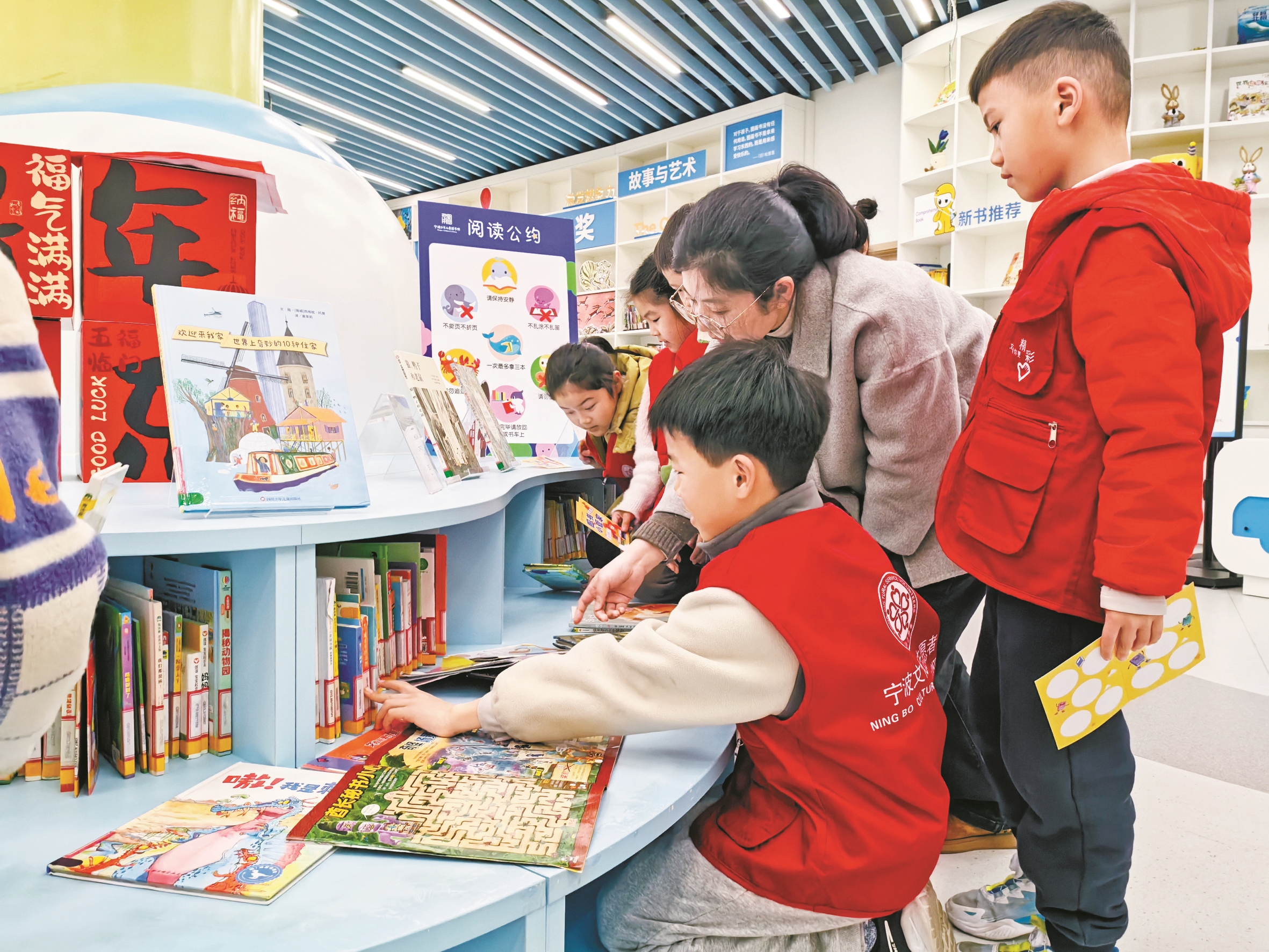 在宁波少年儿童图书馆(以下简称少儿馆)的书架间,总能看到一群特殊的“管理员”:他们背着小书包独自前来,或是拉着小伙伴的手结伴而至。穿上略显宽大的志愿者服装,戴上鲜红的袖章,他们便成了图书的“守护者”。过去一年,373名小管家组成的“护书军团”,用稚嫩的肩膀扛起了整理图书的重任。