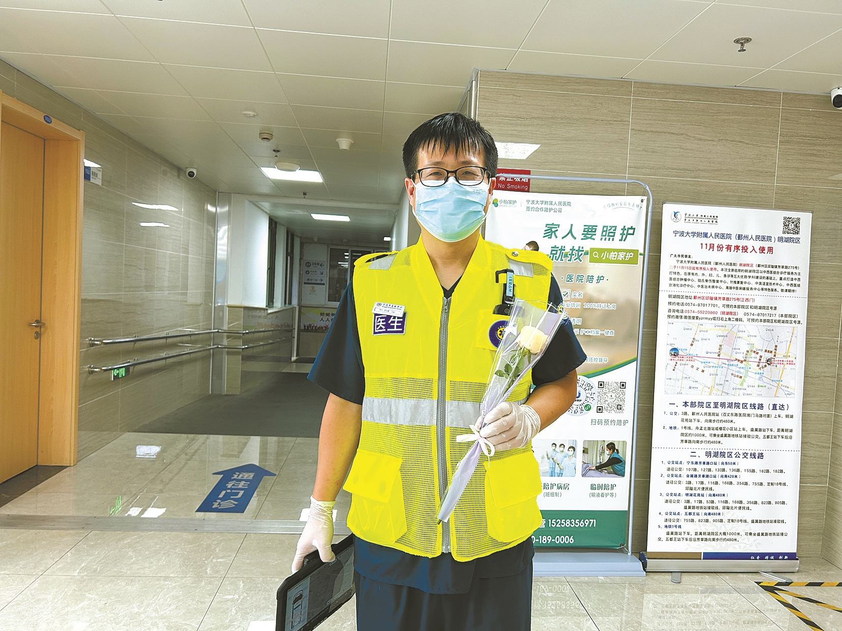 将患者安全送入鄞州人民医院急诊室并完成交接后,范光辉准备离开。“范医生!节日快乐!”相熟的急诊护士拿着一枝鲜花塞入他怀中。范光辉一愣,脸上绽开腼腆而真心的笑容。