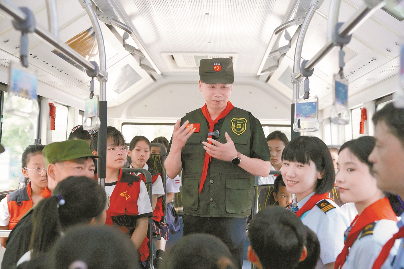 在沉浸式体验中,知识与感动交织。公交30路国防民兵专线班组长、退役军人陶秀明既当“安全员”又做“讲述者”,他细致讲解车厢应急逃生技巧,手把手指导少先队员体验破窗、撤离等动作,随后分享自己“从身披戎装到服务车厢”的故事,生动诠释了军人本色在不同岗位的延续,赢得了阵阵掌声。