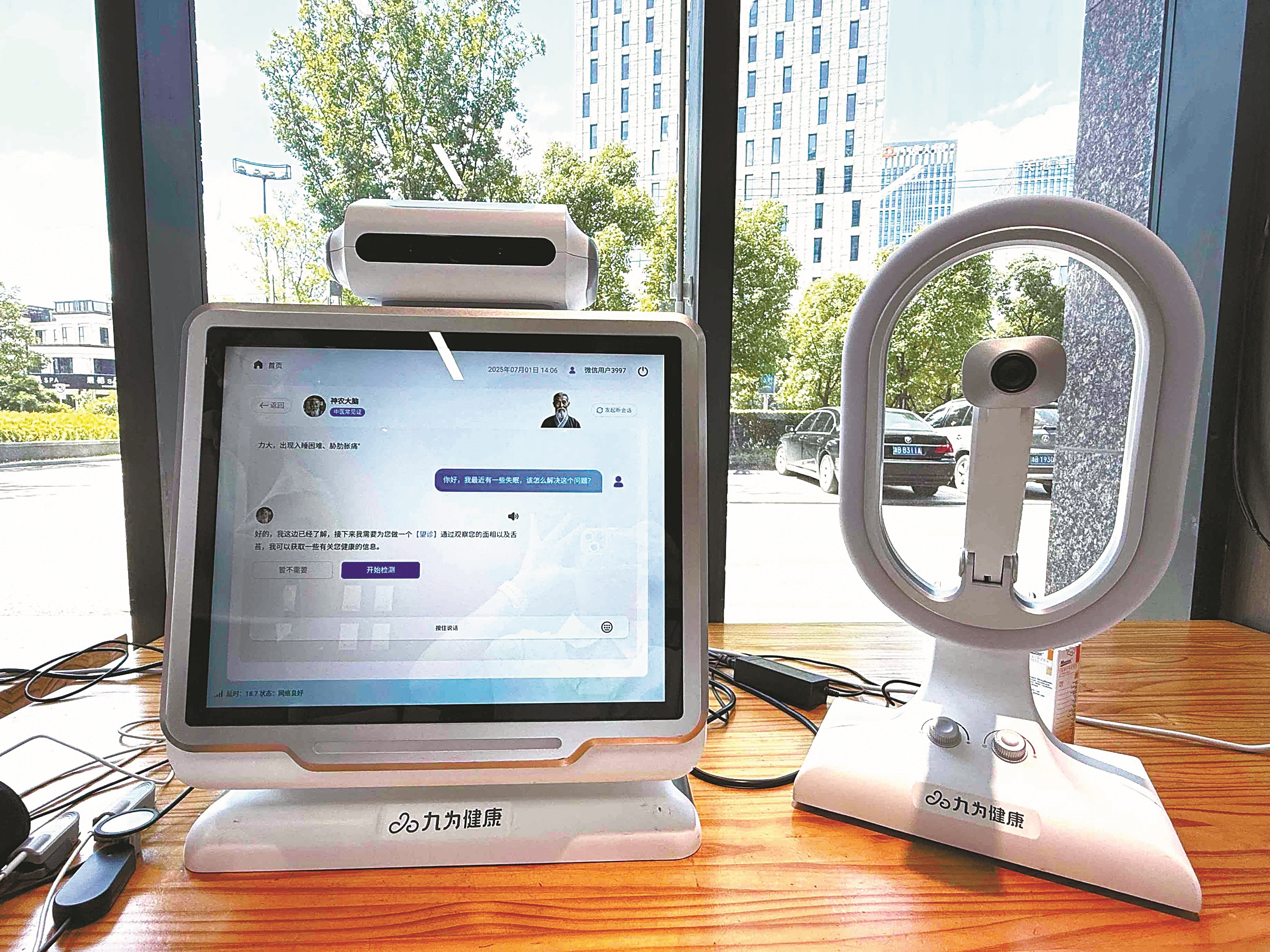 当你对着屏幕描述症状,摄像头就能记录你的面色和舌苔情况;手指轻触脉诊仪,系统便能识别你的脉象;仅需10秒,你就能看到一份自动生成的健康报告,不仅分析症状根源,还贴心推荐“药食同源”的养生方案……这些AI问诊的画面,已出现在九为健康的展厅内。