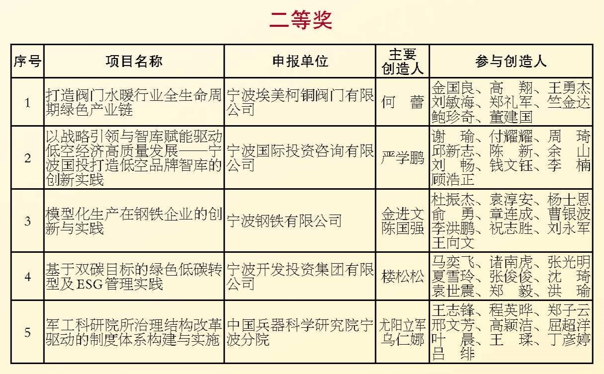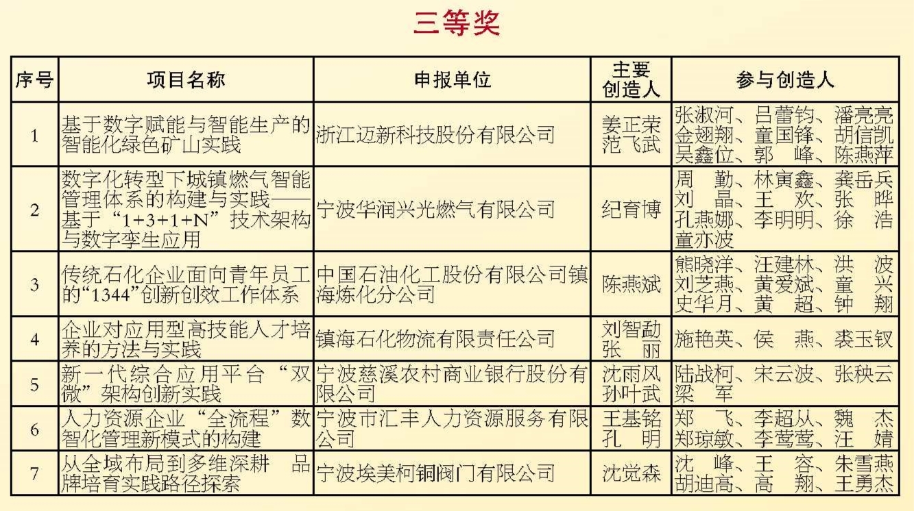 为深入响应中企联、省企联关于推动企业高质量发展的号召,全面落实中央经济工作会议精神和全国两会精神,引导企业深入开展管理创新,助力企业提质增效与转型突破,宁波市企业联合会、企业家协会、工业经济联合会(以下简称市“三会”)组织开展了“2025宁波市企业管理现代化创新成果”的申报与评审工作。通过企业自主申报,评审小组细致审核及专家评审,共有15项成果被审定为“2025宁波市企业管理现代化创新成果”。现将2025宁波市企业管理现代化创新成果获奖名单予以公布。
