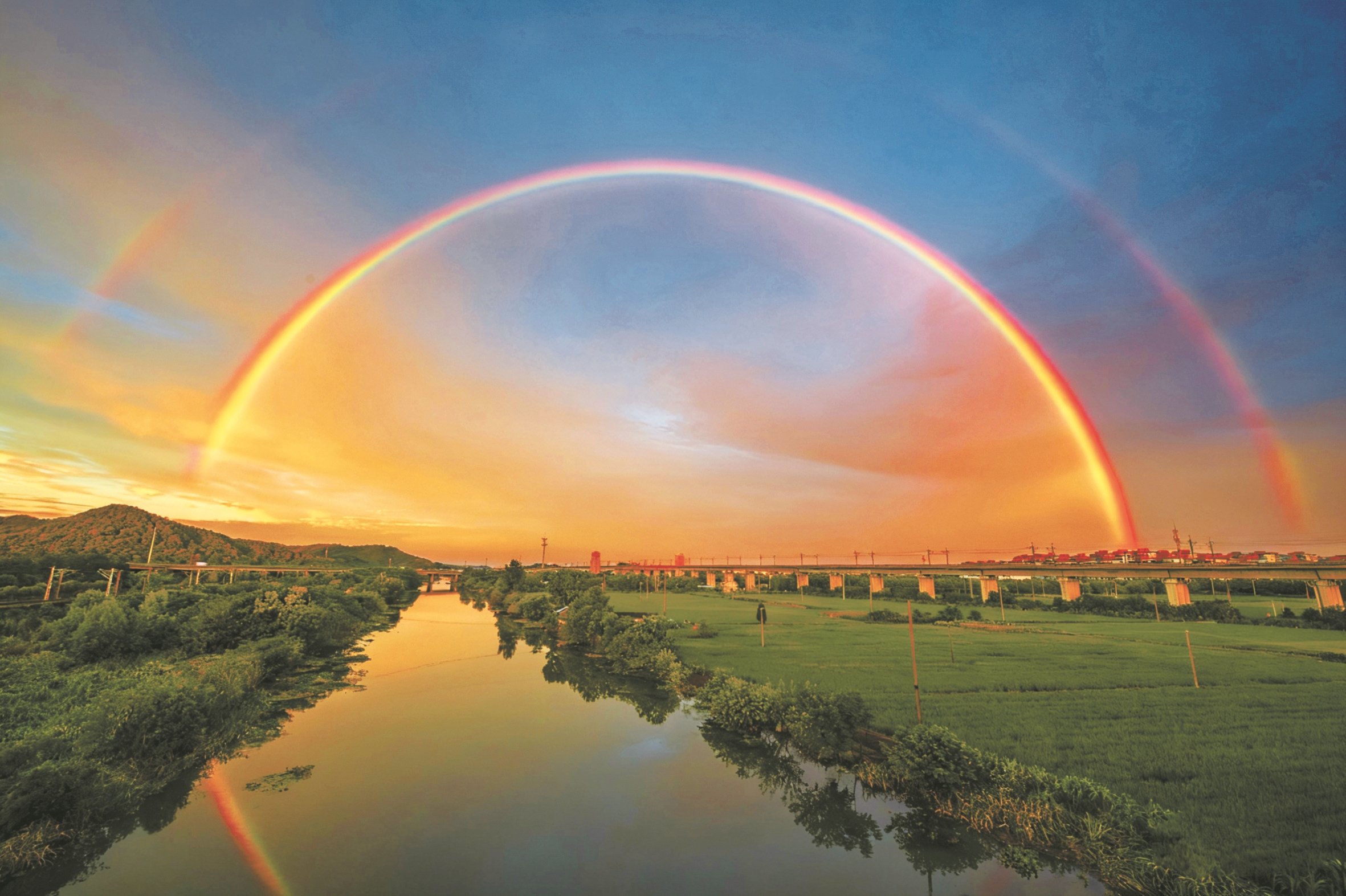 昨日清晨,余姚牟山镇的天空中出现两道绚丽彩虹,横跨于古运河之上,与河畔的绿树、草地及远处的桥梁、房屋相映成趣,构成一幅唯美画卷。(唐严 吴蒙棣 摄)