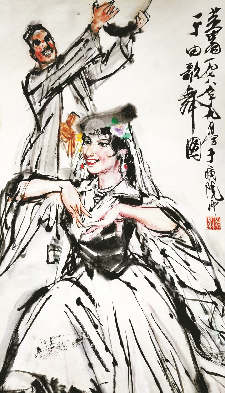 画家还善于抓住人物的动态变化,尤其对人物的手及手指形态变化的表现十分重视,以此展现舞蹈的艺术特点。此外,《于田歌舞图》以黑白墨色为基调,画家在人物的脸部、手部、姑娘头上的鲜花与鼓手身上的腰带使用了暖色,尤其是舞者头上的鲜花如姑娘脸上的灿烂笑容,颜色艳丽、醒目,画面顿时有了生动活泼的气息,可谓“画龙点睛”。
