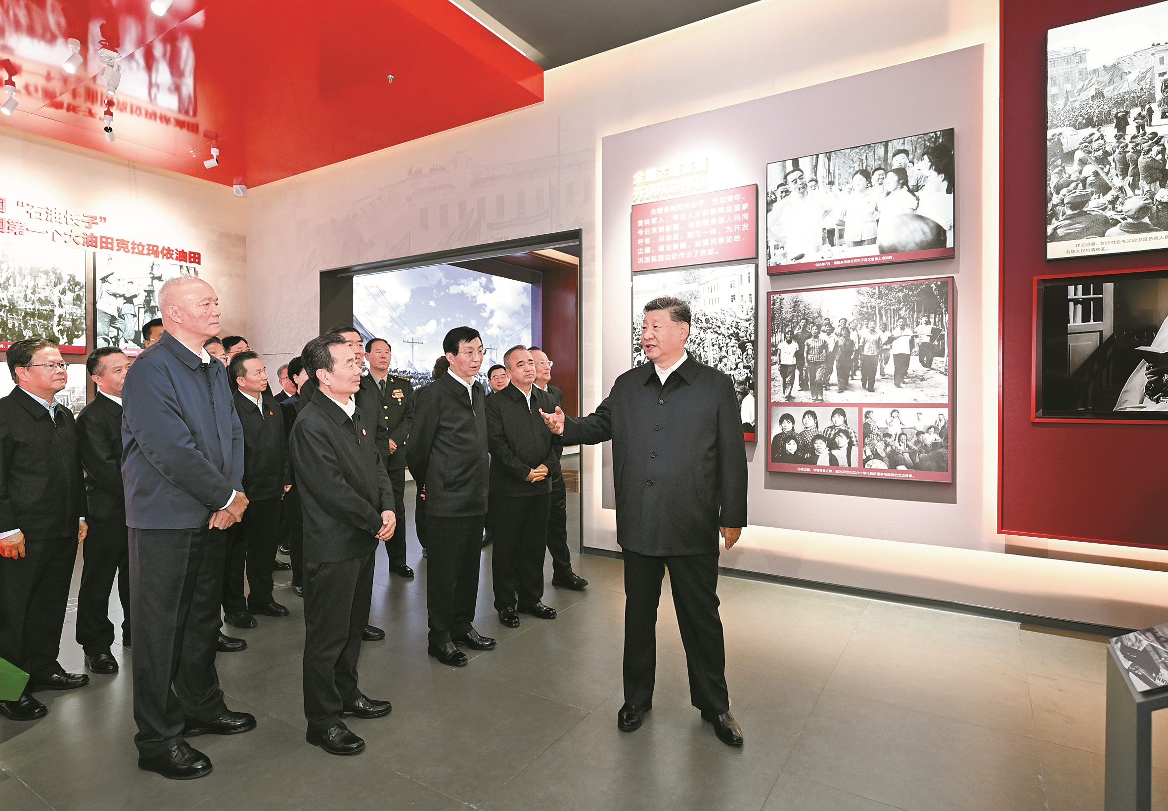 9月24日上午,中共中央总书记、国家主席、中央军委主席习近平在乌鲁木齐文化中心展览馆参观新疆维吾尔自治区成立70周年主题成就展。(新华社记者 谢环驰 摄)