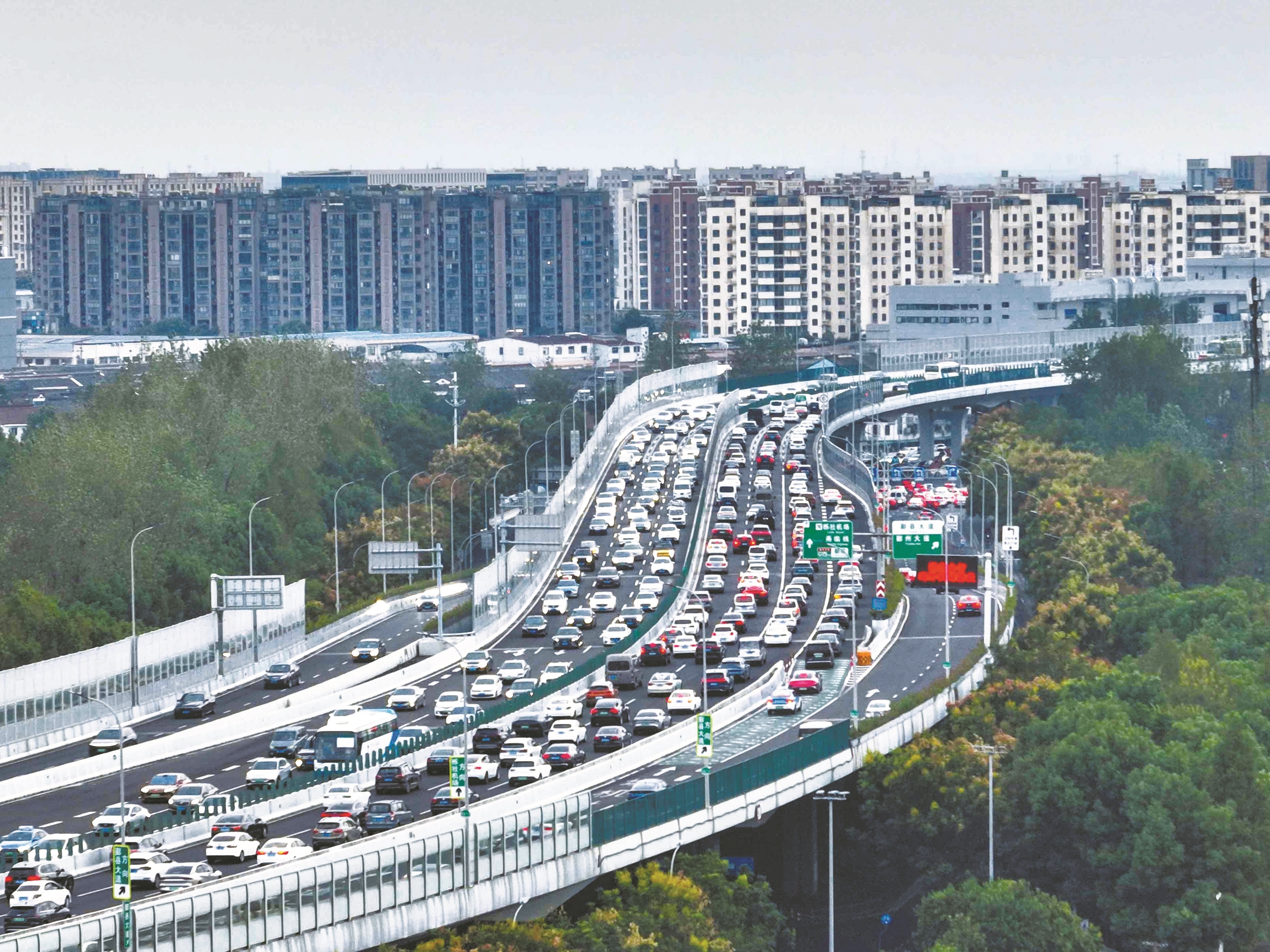 昨日下午,机场路高架上,车辆已排起长龙。(徐能 摄)