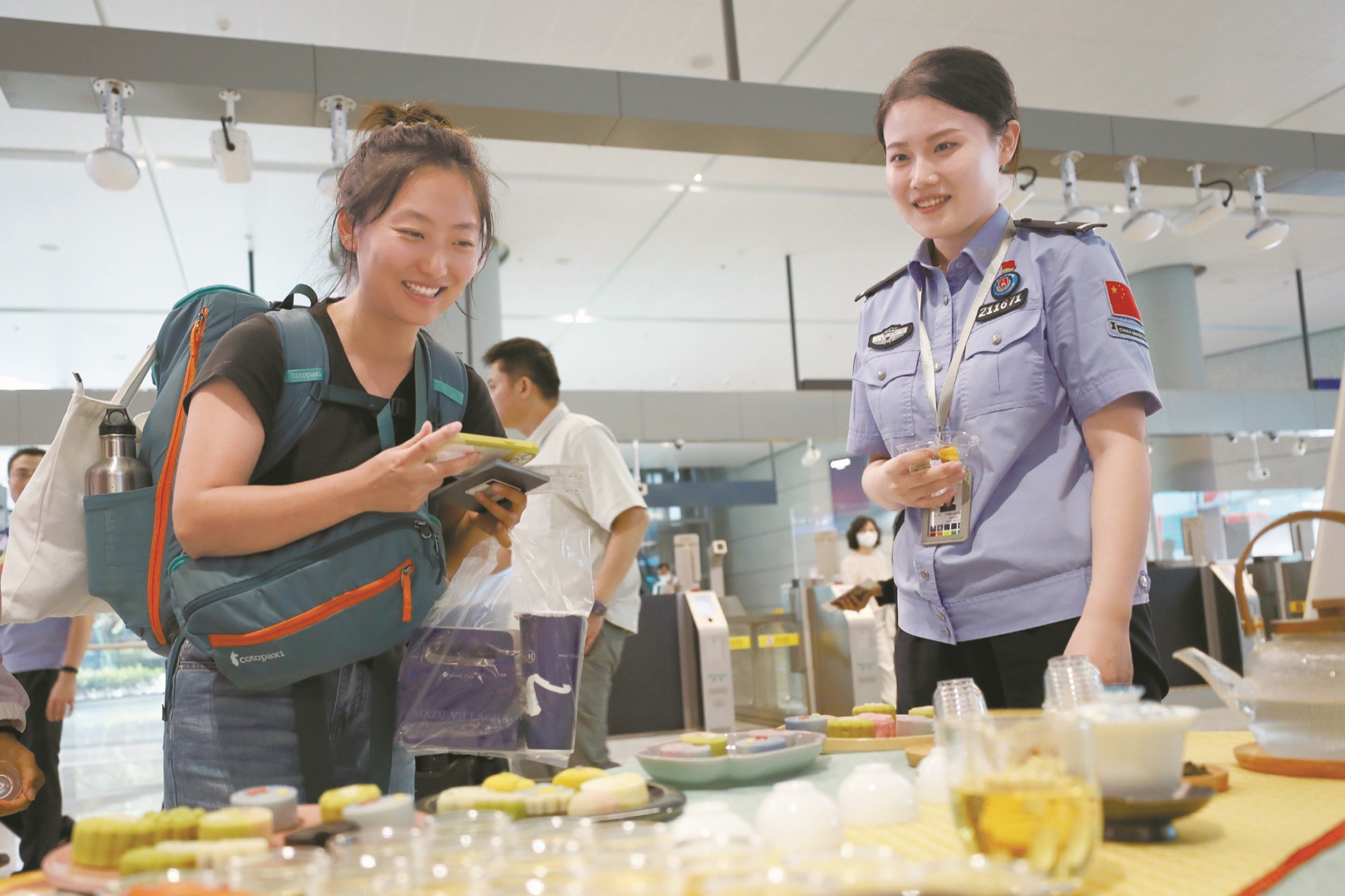 宁波栎社国际机场,旅客在参加迎中秋活动。(徐能 摄)