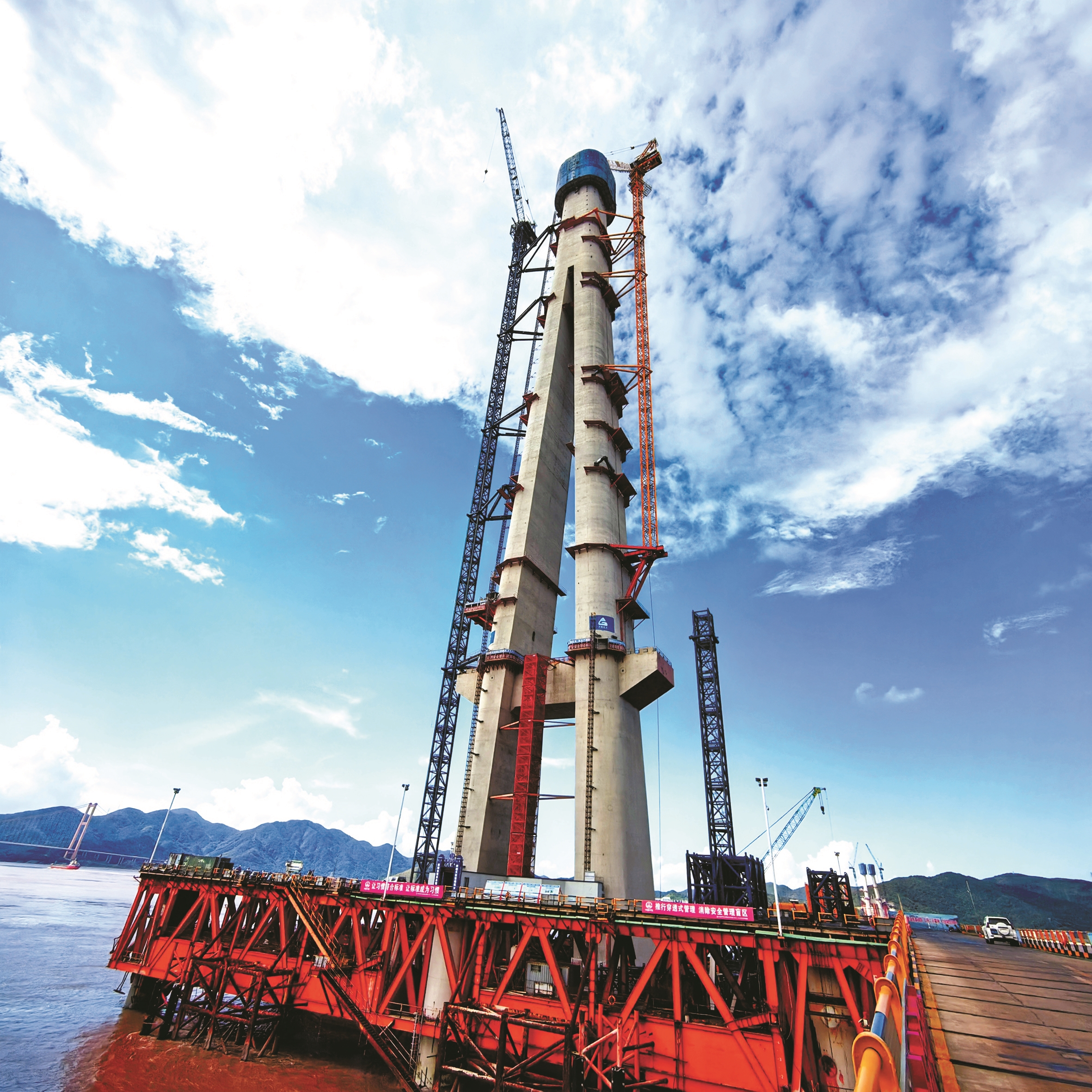 西堠门公铁两用大桥共有4号、5号两座主塔,均为“A”字形钢筋混凝土结构,塔高294米(含塔座),建成后将是世界第一高的海中桥塔。主塔塔身共划分为50个施工节段,其中下塔柱8节、中塔柱22节、上塔柱20节。