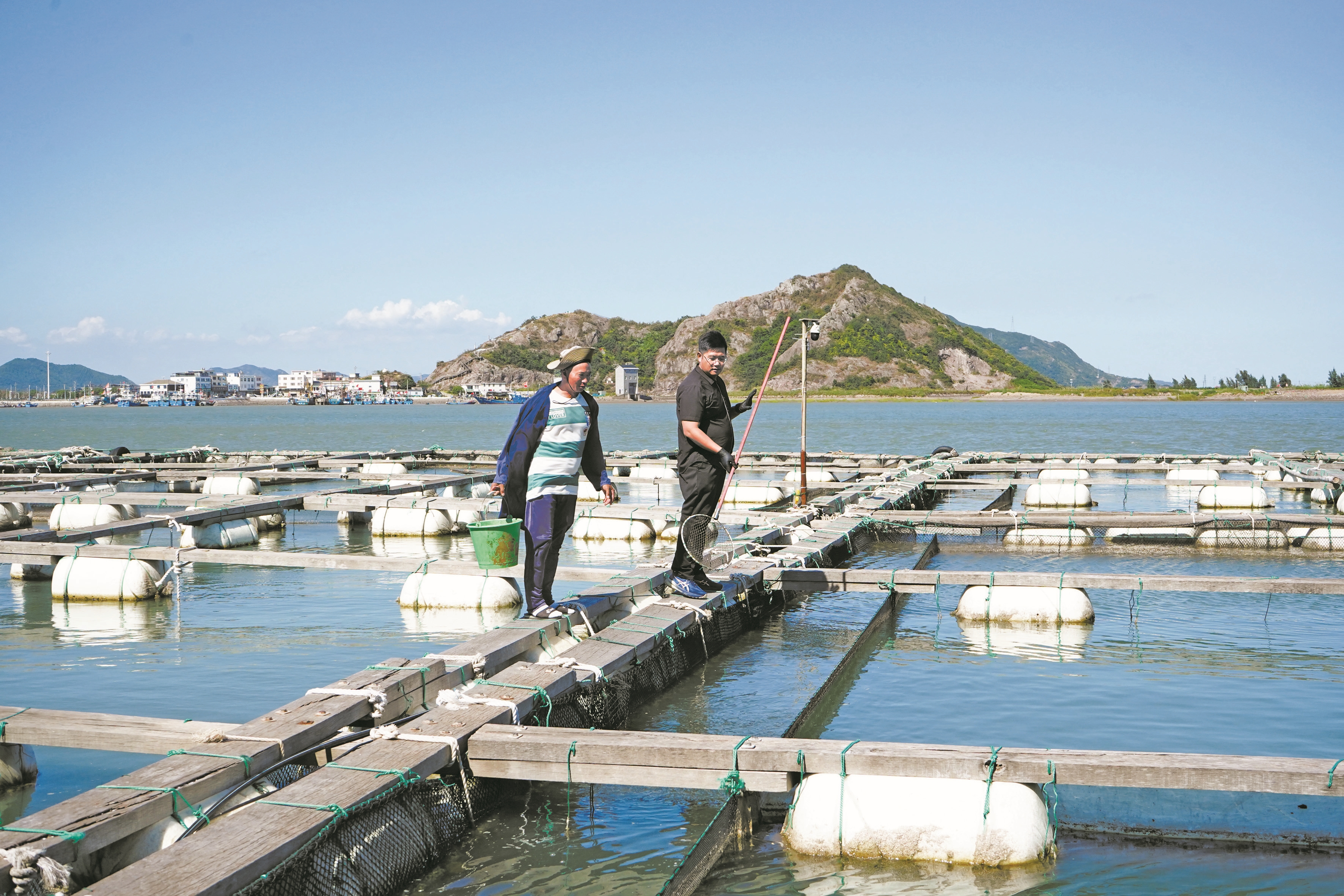 象山大黄鱼养殖户在渔排上忙碌。 (何晴 摄)