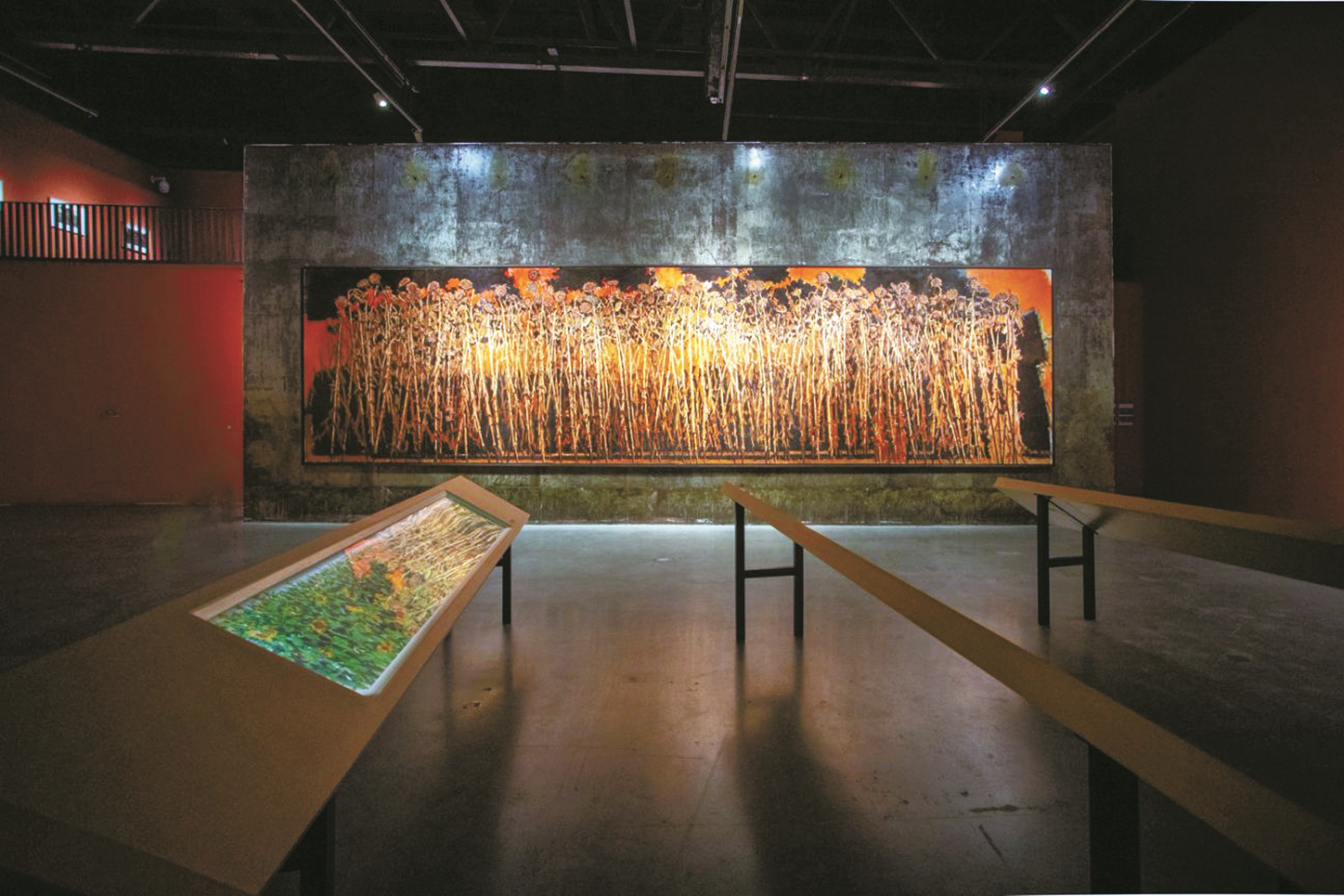 这些葵有的通红似火,有的带着被灼烧过的金属质感,整个展厅里,高大的钢铁建筑与这片葵园形成了独特的呼应,仿佛在共同诉说着一段厚重的故事。如果走到楼上俯瞰,还能感受到葵园里“老的正在老去,新的正在生成”的生命力,那种磅礴的力量会把人的思绪推向更远的地方。
