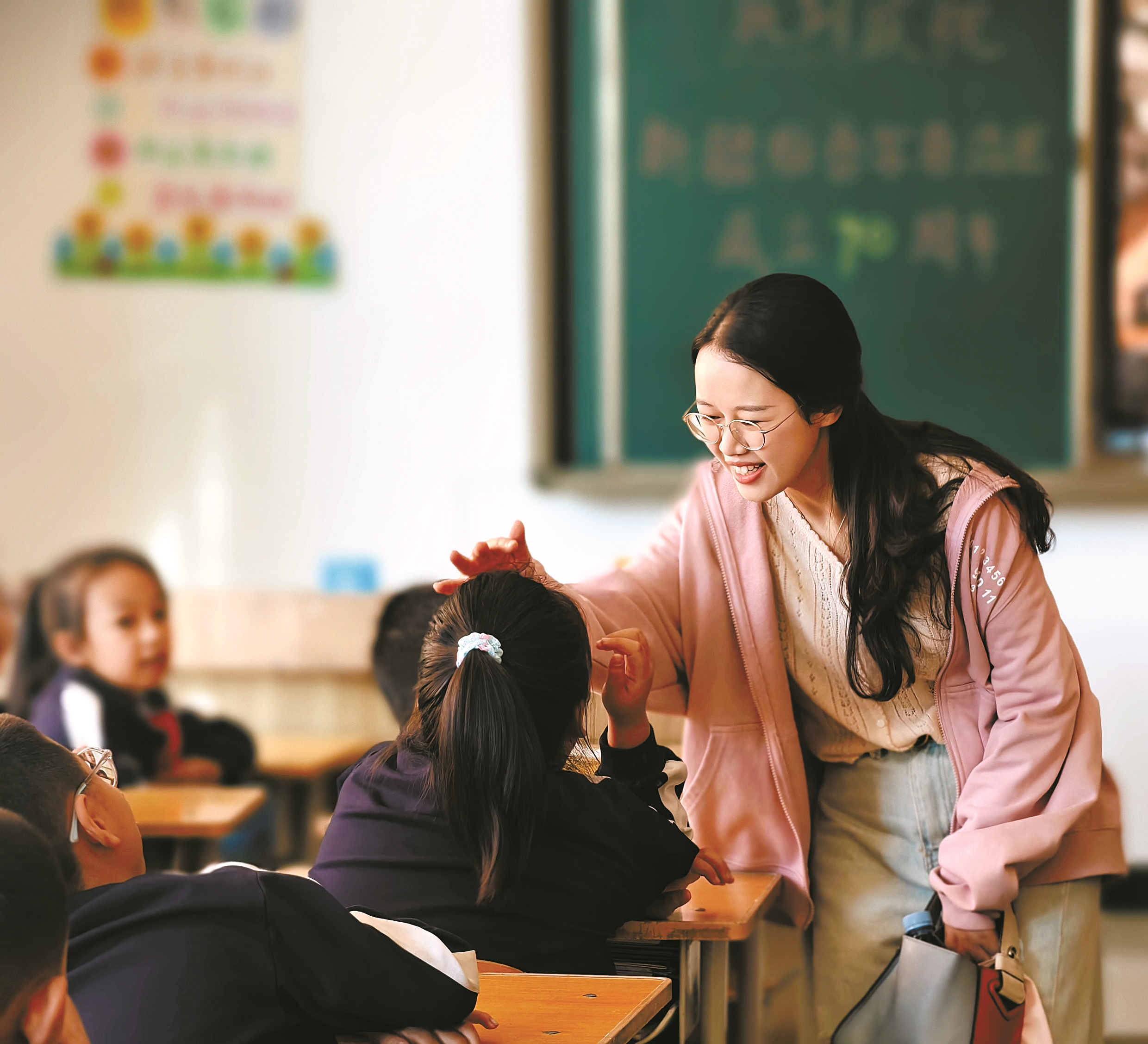 “陈老师,您设计的‘普通话牌’,我们还在用呢!”一位扎马尾的小女孩兴奋地说,“我们还教爸爸妈妈、邻居叔叔阿姨一起学,大家都很喜欢……”