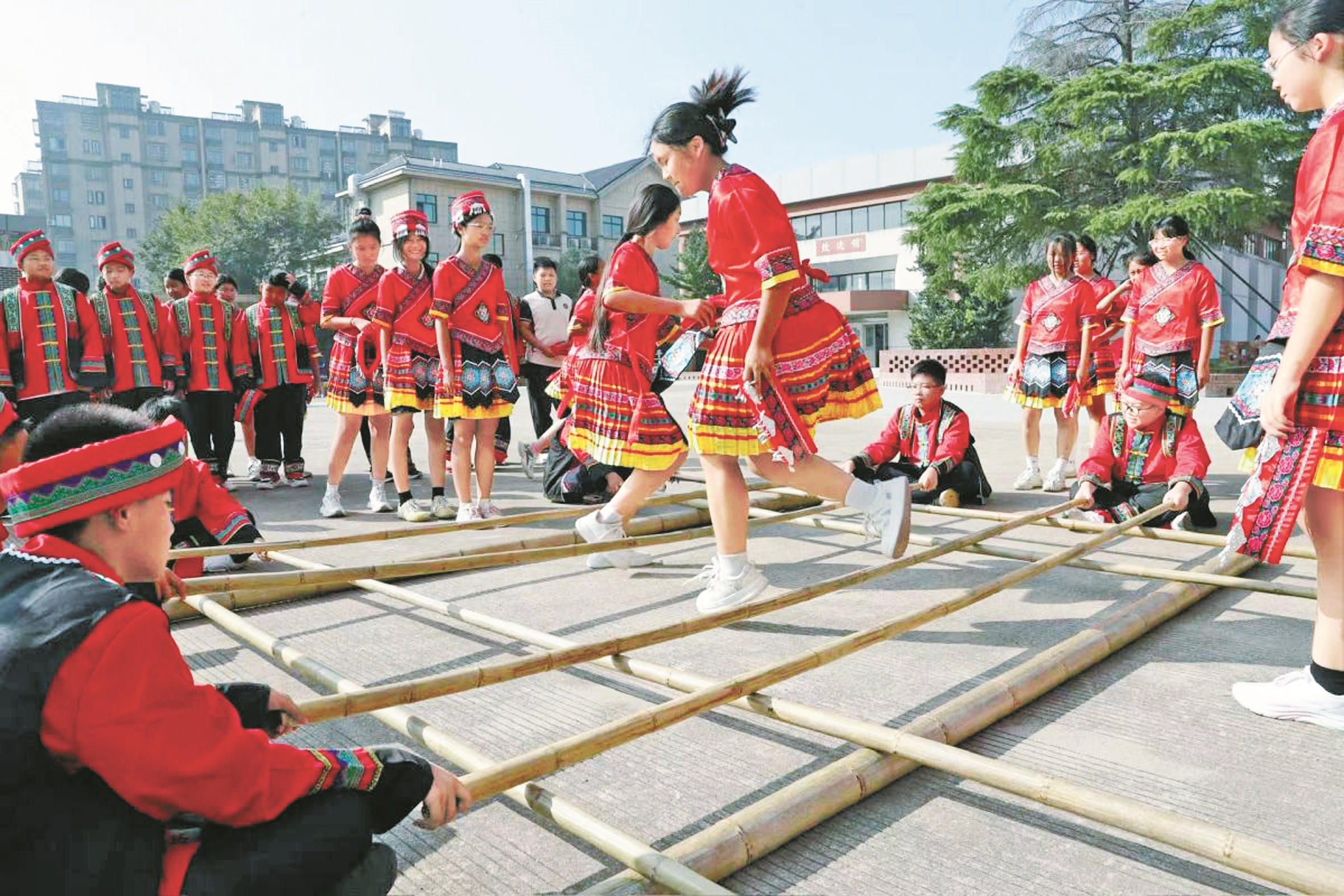 该校学生以外来务工人员子女为主,班级根据生源特点选择项目:如黎族学生较多的班级选竹竿舞,壮族学生较多的班级选打扁担。体育教师会提前培训骨干学生,再由他们带领全班练习。竹竿舞需要多人配合,孩子们在训练中学会分工协作,班级氛围更融洽了。