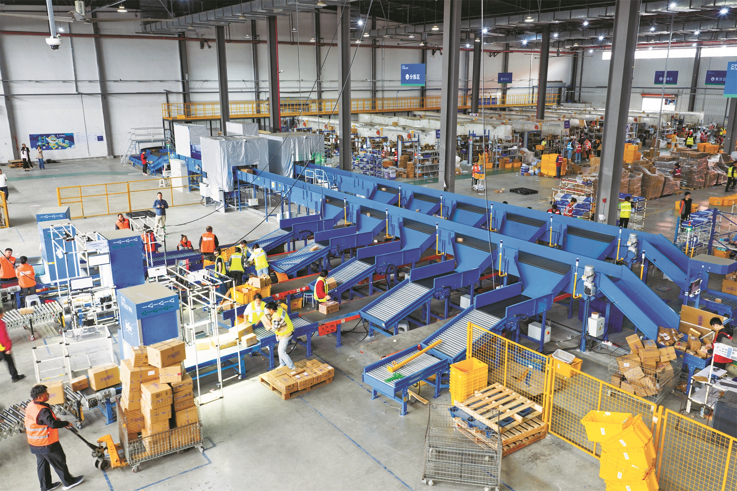 北仑港综合保税区菜鸟1号仓库内,数百名工作人员正紧张有序地进行理货、拣货、上架和打包作业。