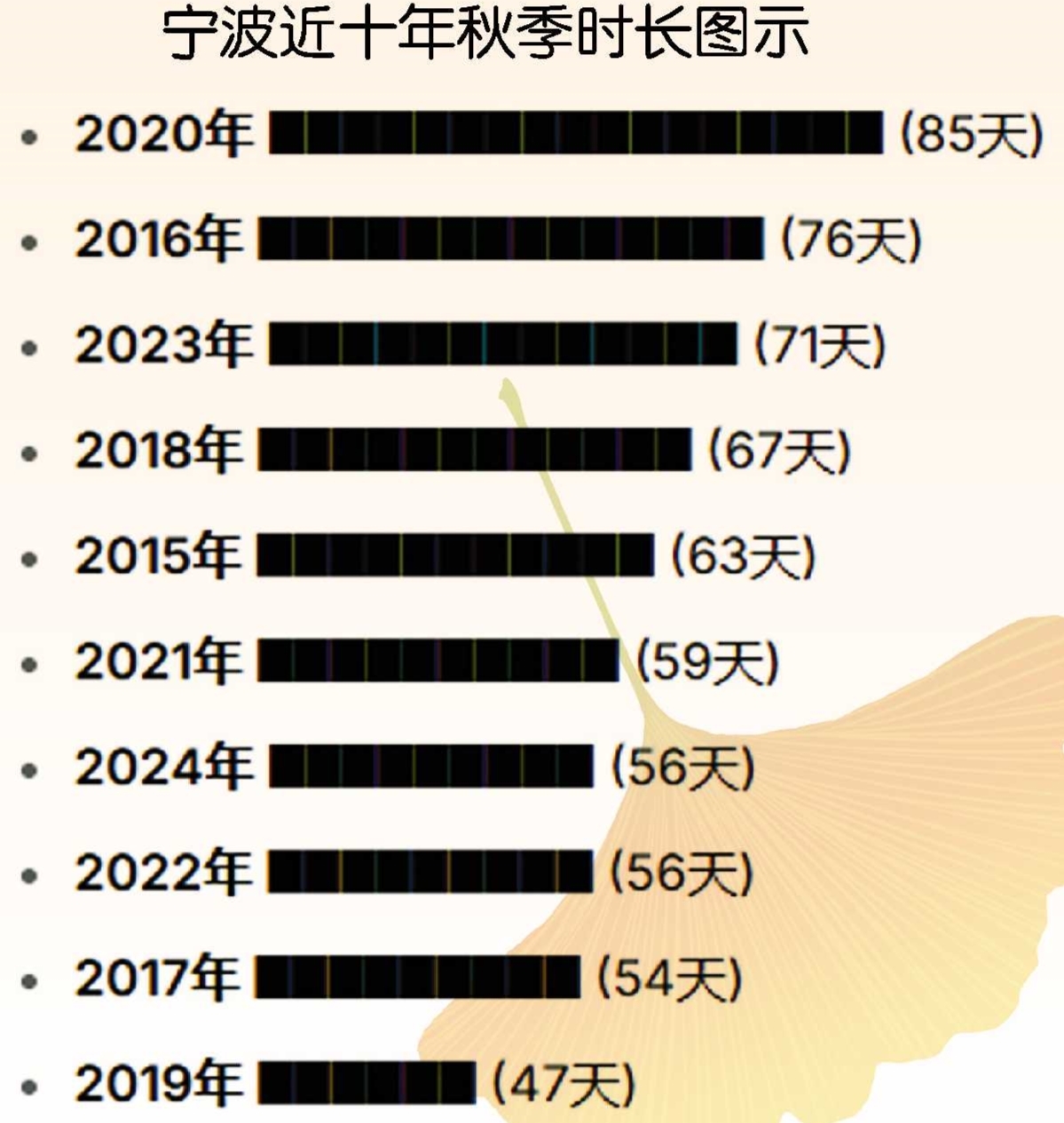 尽管市民感觉秋天“转瞬即逝”,但气象学上的秋季长短需待季节结束方能定论。梳理2015年至2024年的气象数据发现,宁波秋季时长波动显著:秋季时长最长为2020年的85天,最短为2019年的47天,相差达38天。近四年(2021年至2024年)的秋季时长分别为59天、56天、71天和56天,呈现一定的波动性。