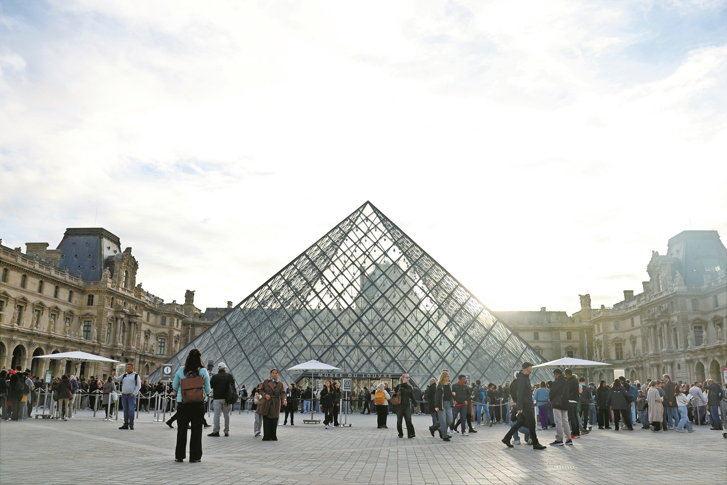 10月22日,在法国巴黎,大量游客聚集在卢浮宫博物馆的玻璃金字塔入口前。在法国卢浮宫抢劫案事发3天后,这座博物馆22日恢复开放。 (新华社发)