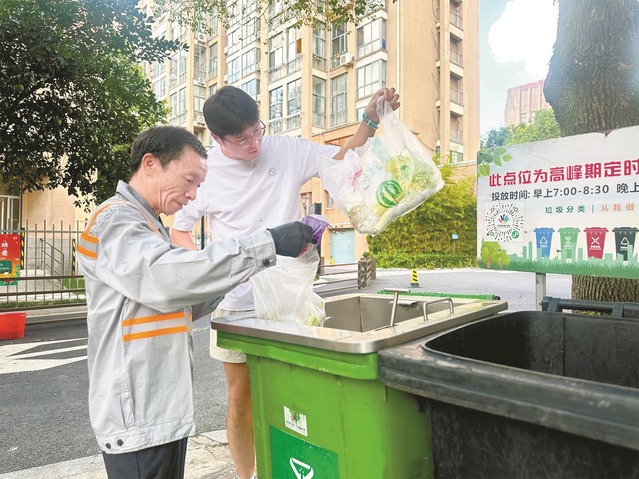 ③垃圾分类督导员协助市民进行厨余垃圾破袋投放。