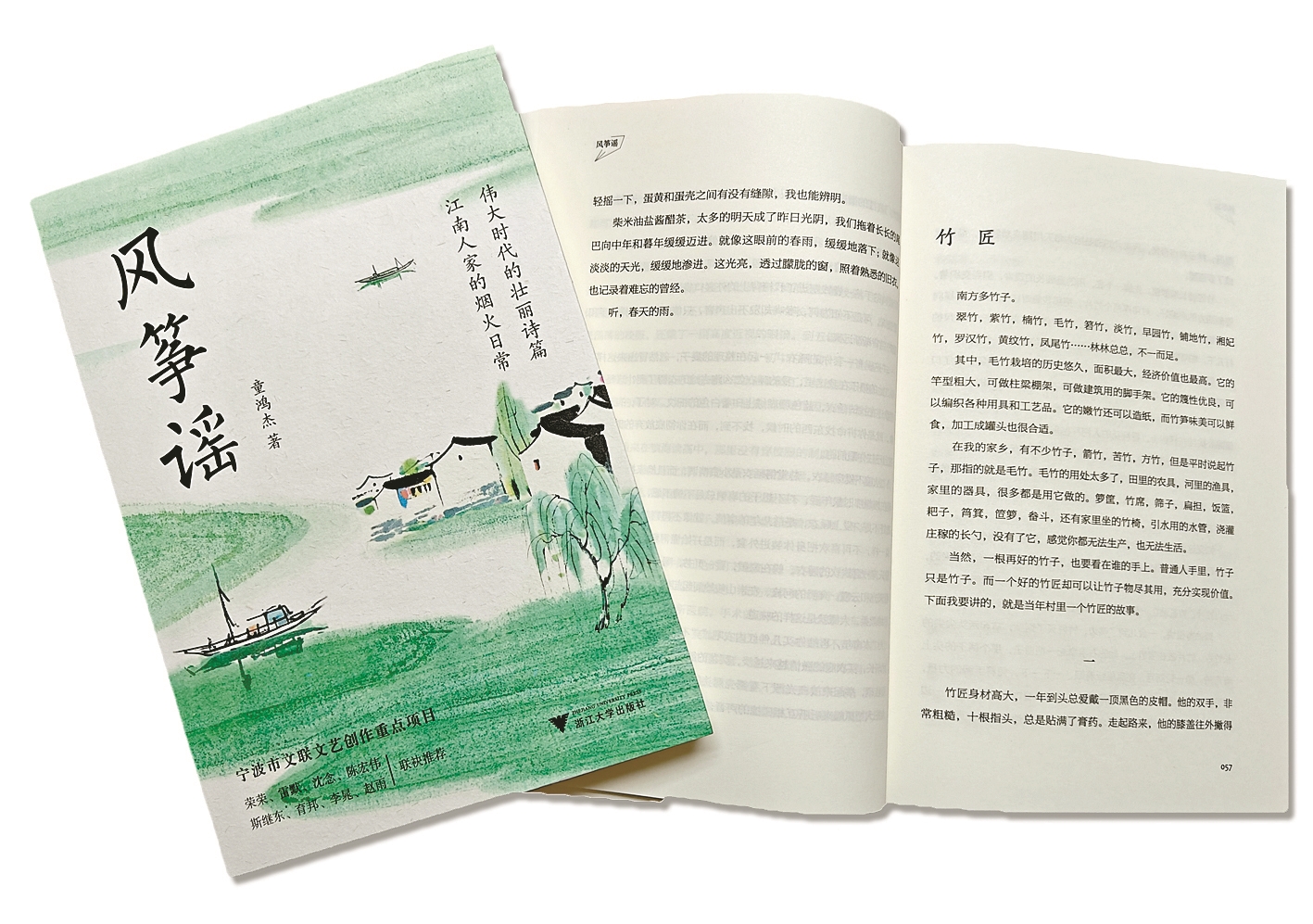 青绿的封面像水墨晕染的江南春岸,小船、屋舍、垂柳在笔意间勾勒出烟火日常的诗意长卷。翻开北仑作家童鸿杰新出的散文集《风筝谣》,一股熟悉的气息扑面而来——那是泥土被春雨浸润后的清新,是陈年竹器散发的微香,是岁月深处飘来的炊烟味。与其说这是一本书,不如说是一条通往故乡的隐秘小径。沿着文字铺就的青石板路往前走,你会遇见村口那棵虬枝盘错的大樟树,听见小浃江水轻轻地呜咽,望见老鹰山上盘旋的飞鸟。
