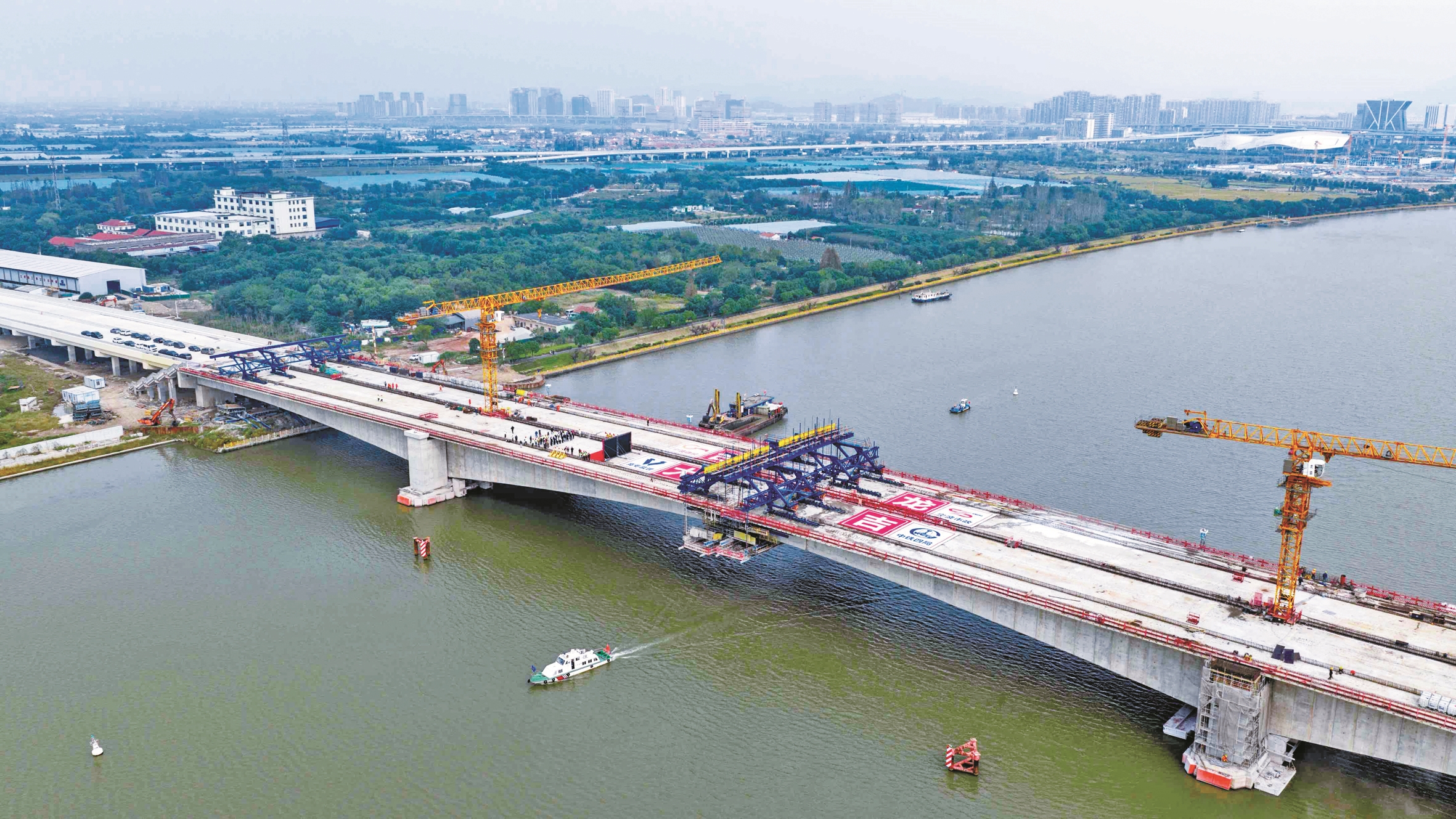 本报讯(记者王嘉彬 冯瑄 通讯员叶嘉庭 郁景雯)随着最后一方混凝土浇筑完毕,10月26日晚,邵家渡大桥主桥实现全桥合龙,大桥主体结构施工全部完成。