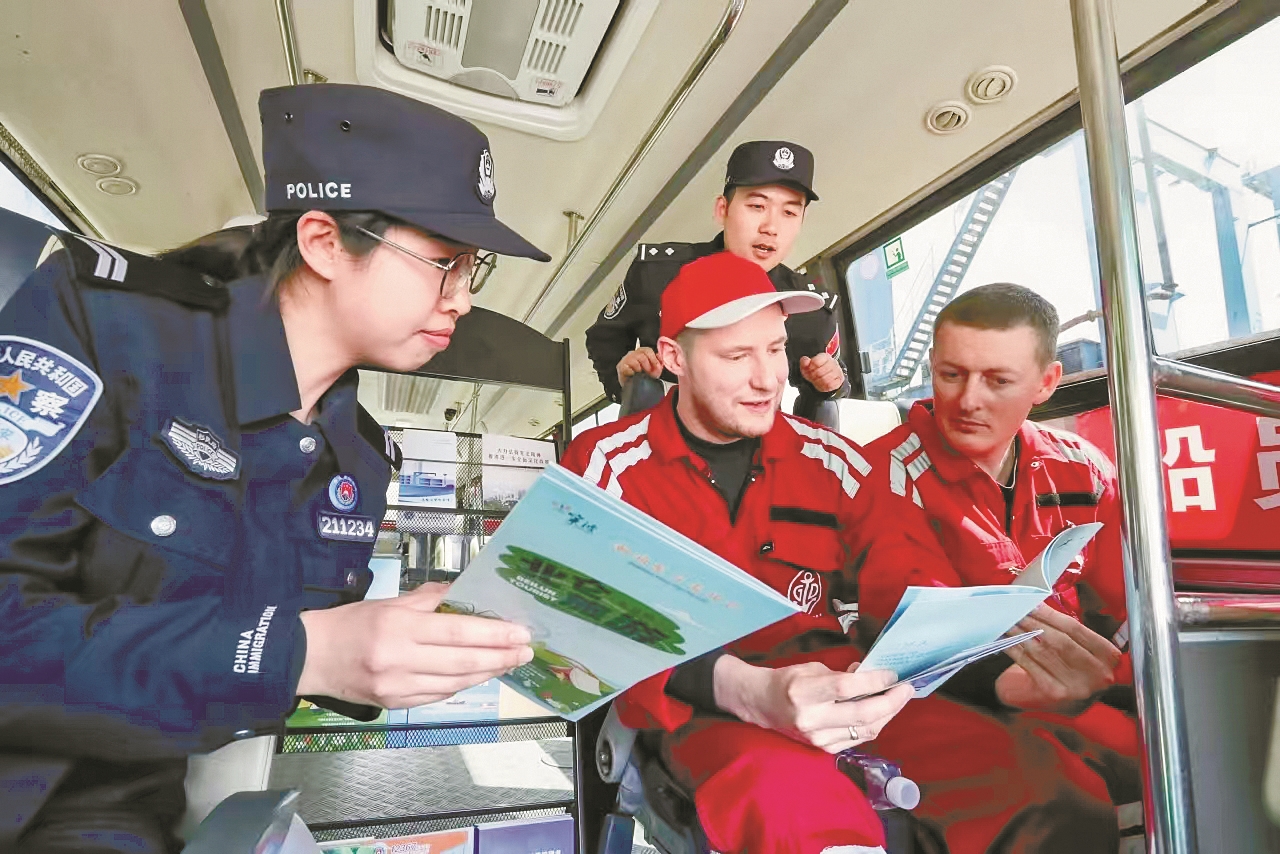 这不仅仅是一段接驳旅程,车厢本身也化身为“移动普法课堂”——车内放置的中英文《服务指南》及多语种法律知识手册,成为船员们了解中国法治的一扇窗。