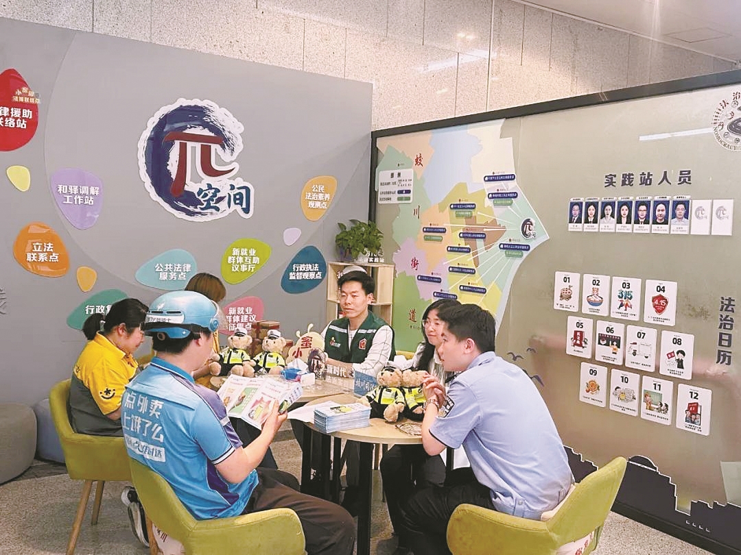 作为镇海区首个聚焦新业态的新时代法治实践站,“π空间”整合法援、调解、立法联系等九大功能,通过首问负责、限期反馈等机制,推动法治服务从“被动响应”转向“主动问需”,为新就业群体筑起身边的法律“防护盾”。