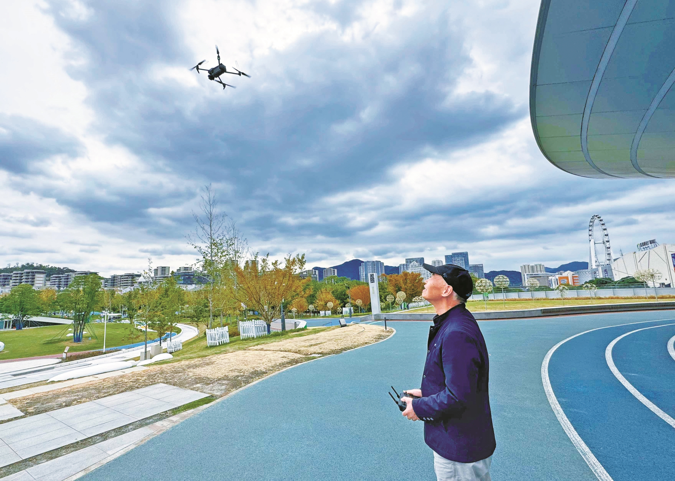 在北仑新碶街道,一位老人正仰头望向天空,手中遥控器轻巧拨动,一架无人机呼啸升空,掠过凤凰山公园、穿过高楼间隙,将城市风貌尽收眼底。他是84岁的李纯和,一名玩转无人机航拍的“老飞手”。