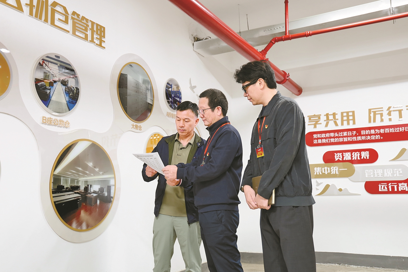 图为北仑区纪检监察干部深入区级行政事业性国有资产公物仓开展监督检查,通过实地查看、核对台账等方式,助力公物管理规范有序、阳光透明。(汤静 摄)