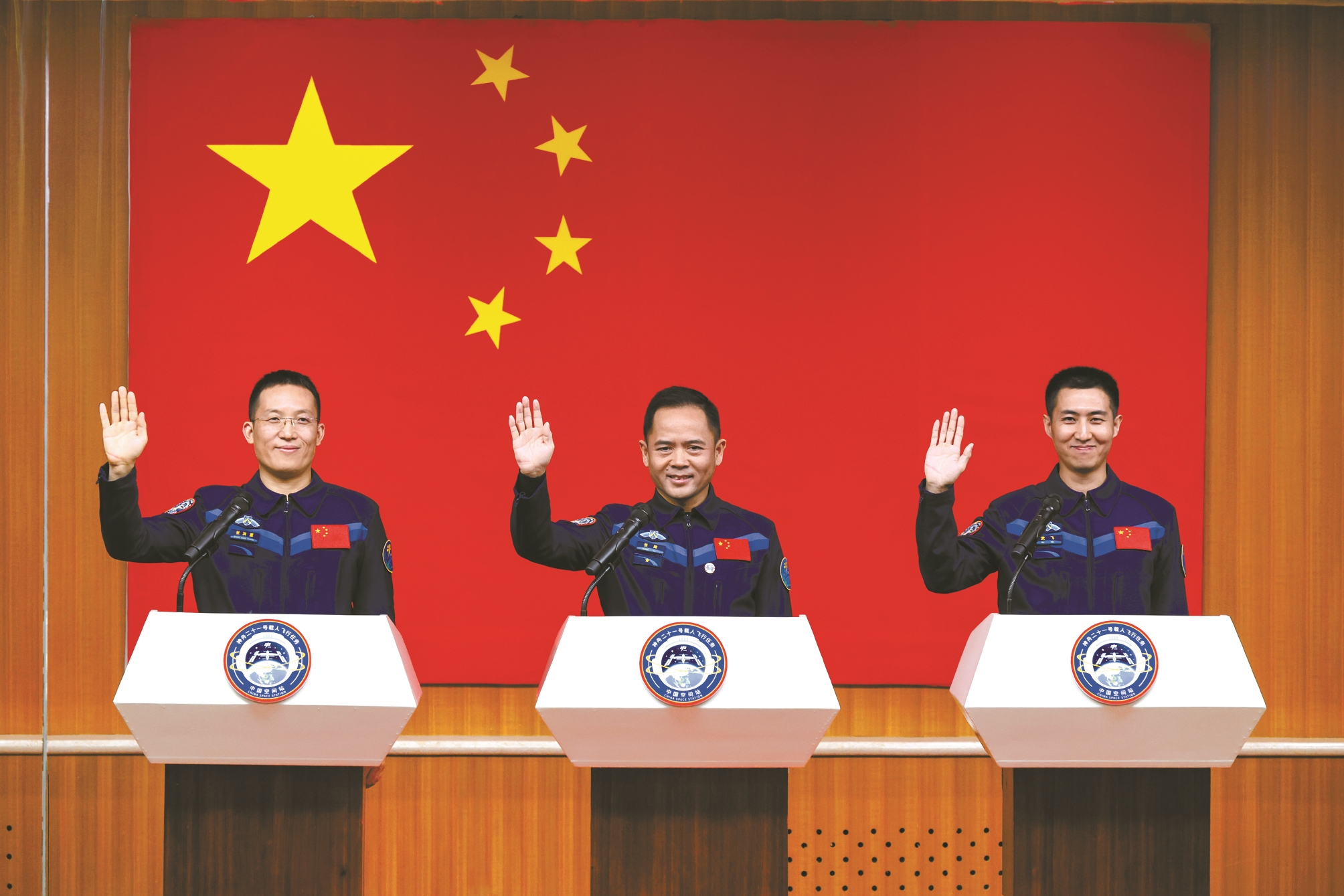 10月30日,神舟二十一号载人飞行任务航天员张陆(中)、武飞(右)、张洪章在酒泉卫星发射中心问天阁与媒体记者集体见面。 新华社发(汪江波 摄)
