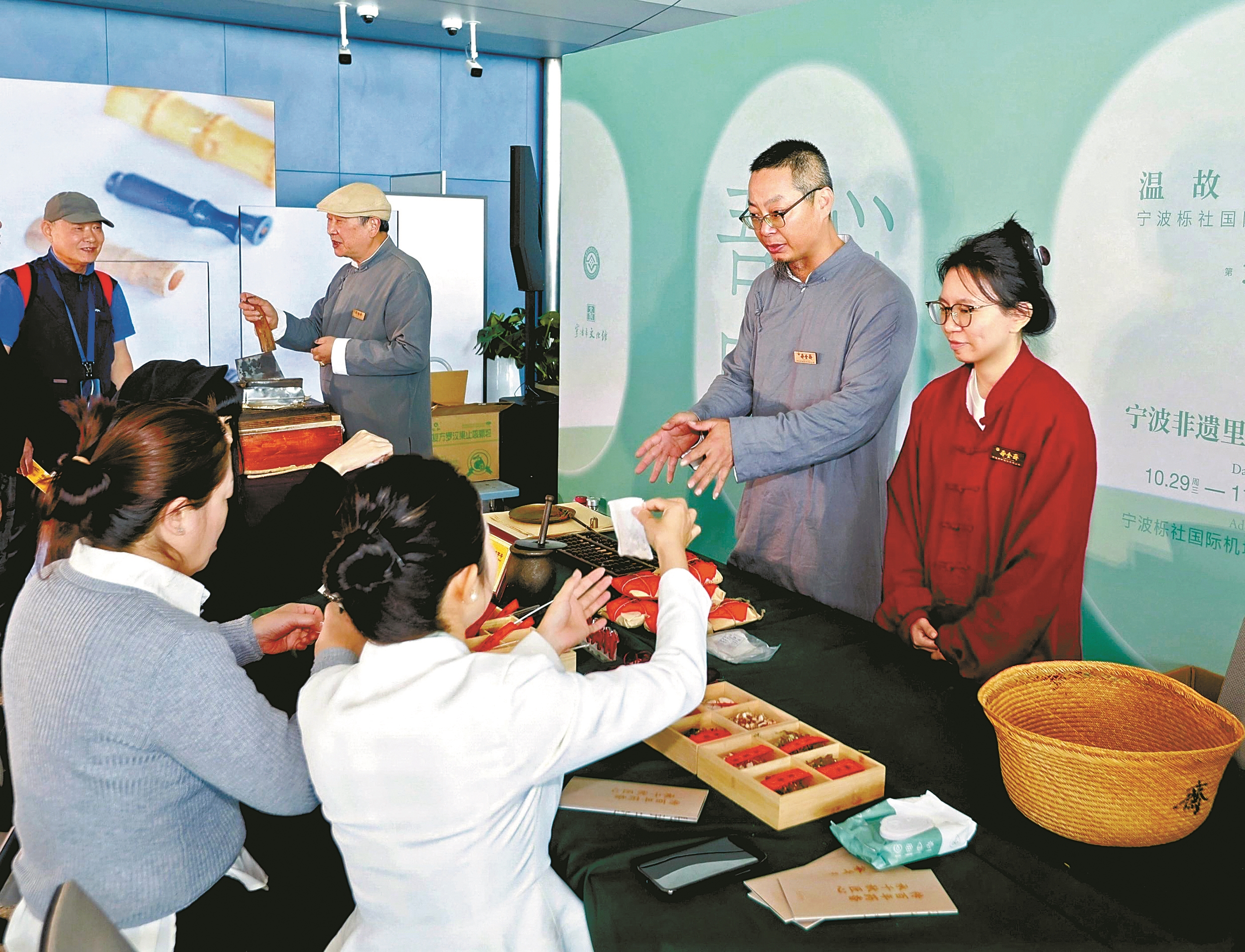 登机广播与甬剧唱腔在航站楼内交织,机场展柜里透出越窑青瓷的温润光泽……昨天,“温故”非遗展第三十四回,在宁波栎社国际机场T1航站楼开展。
