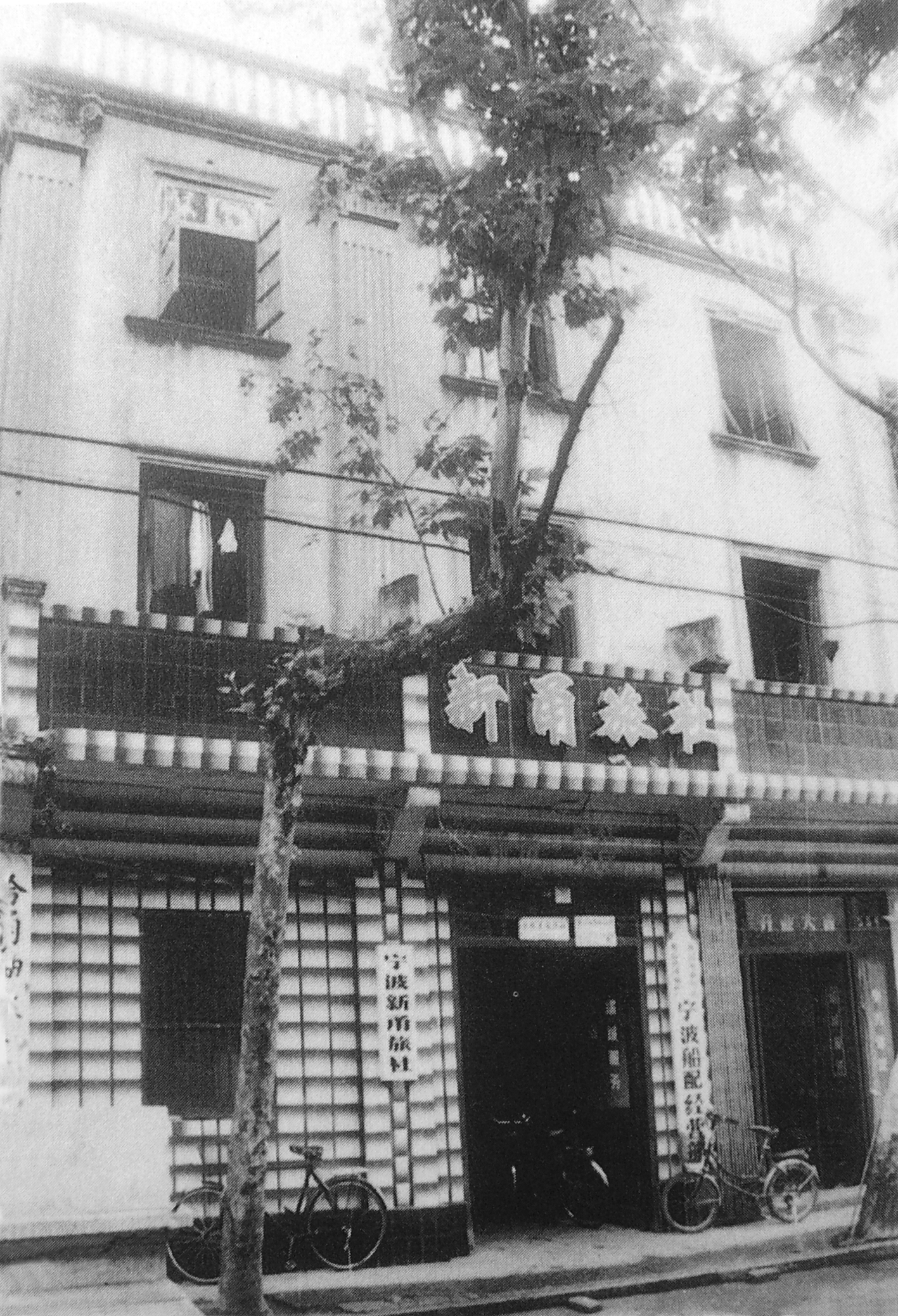 这座建筑,在外滩改造之前是新甬旅社(图②)。笔者在江北区商业局工作期间,曾多次进入新甬旅社,也曾登上旅社三楼顶上的平台。当时,中马路西侧与新甬旅社南北毗邻的老建筑,皆为坡顶,唯新甬旅社有局部平顶,屋顶上有间可出入平台的小屋,推测它可能就是原先瞭望台的位置。