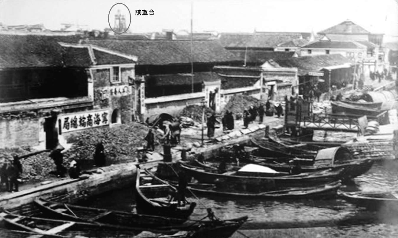 水龙会在各自区域内,均建有瞭望台一所,“遇警鸣锣,以司事一人督率人夫往救”。有一张老照片摄于20世纪10年代(图①),远景中一座矗立于屋顶之上的岗亭般的建筑,应该就是天一救火会的瞭望台。