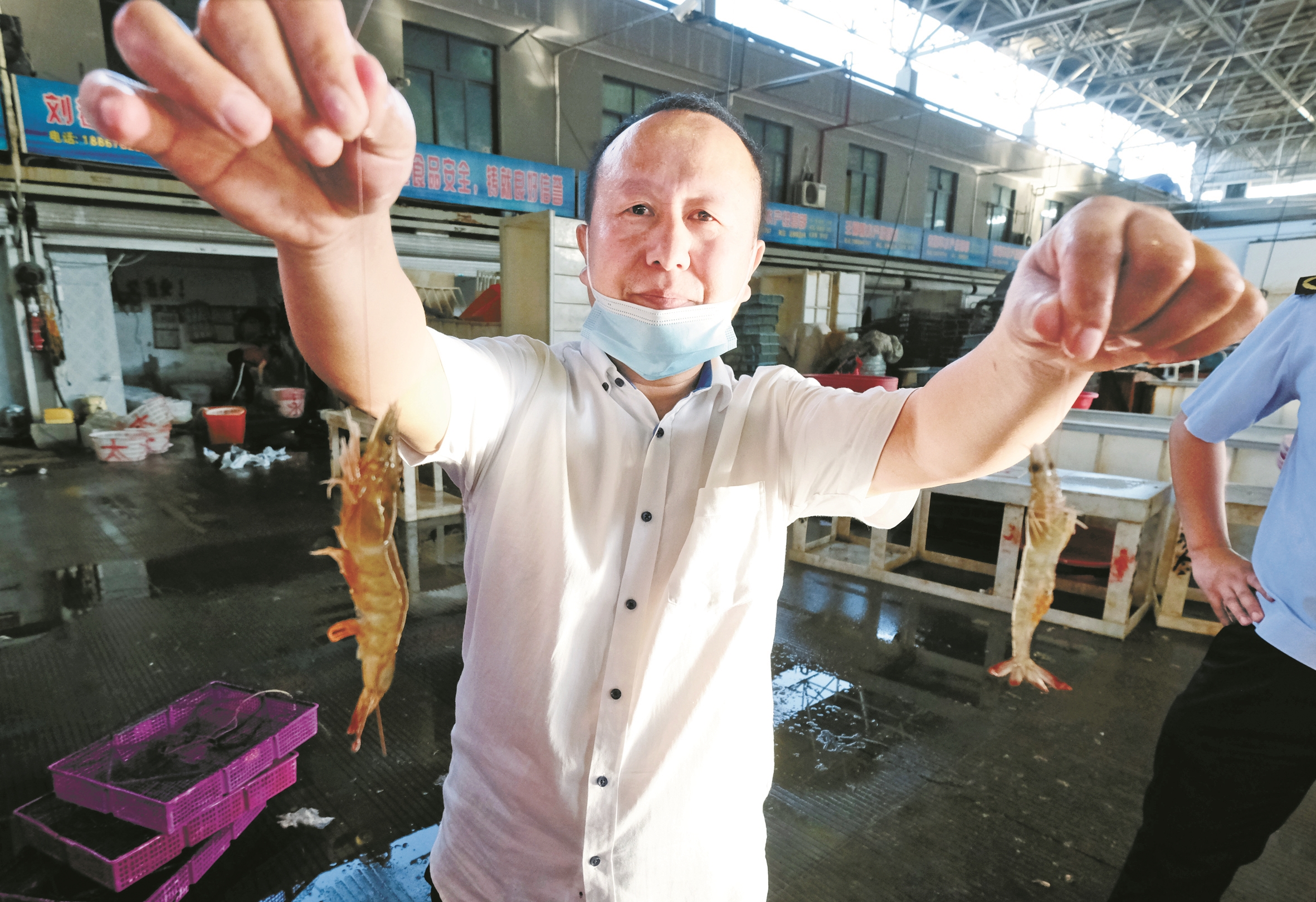 宁波水产品批发市场工作人员展示南美白对虾。(陈结生 摄)