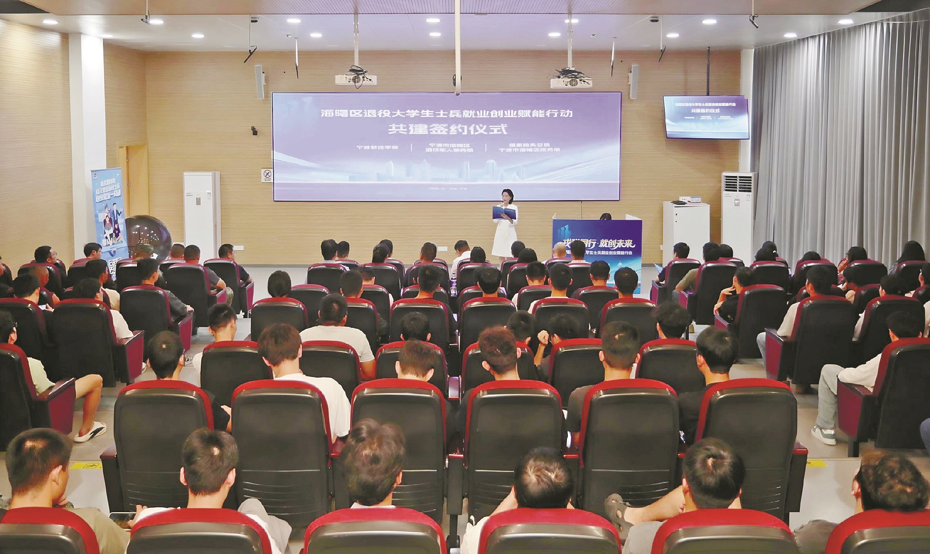 本次活动由海曙区退役军人事务局、国家税务总局宁波市海曙区税务局、宁波财经学院联合主办,旨在整合多方资源,为退役大学生士兵顺利融入社会、实现高质量就业创业保驾护航。学校、退役军人事务部门、税务部门相关负责人,以及企业家代表和约百名海曙区退役大学生士兵参加活动。