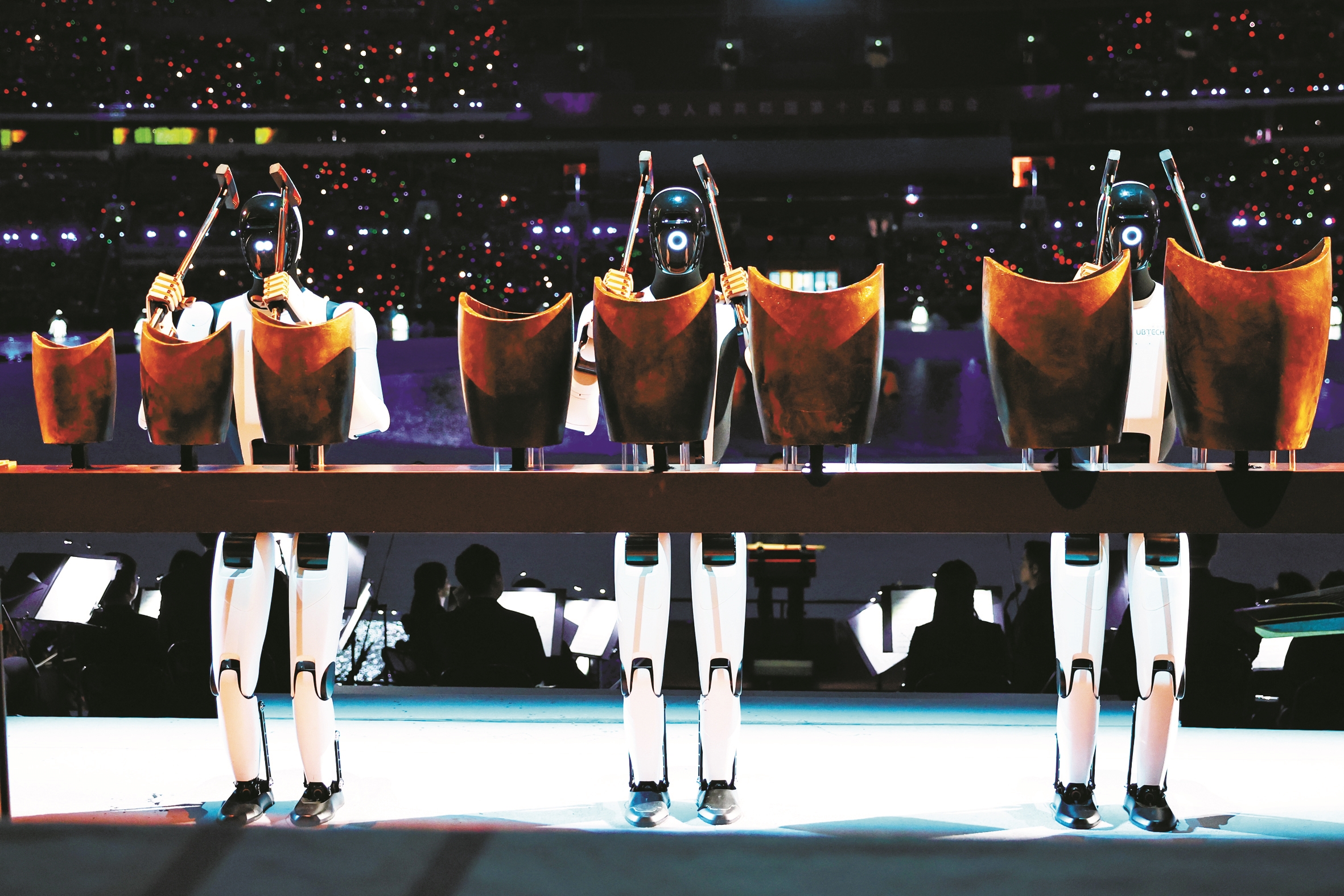 顺着那束光望去,奏响文艺展演第一串音符的,是三台工业人形机器人。它们站在交响乐团最后一排,双手持锤,敲击着千年前的中国古代乐器——青铜句鑃。