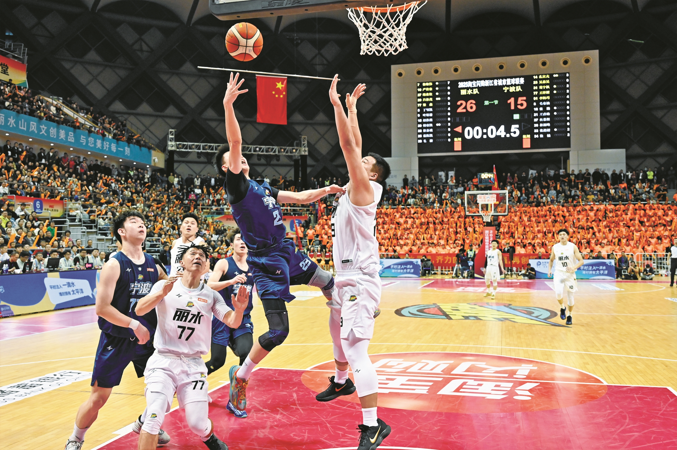 昨晚,丽水市体育中心氛围热烈,宁波队客场挑战丽水队。整场比赛跌宕起伏,宁波队虽凭王泽耀、葛宁枫等核心球员高光表现多次反扑,但关键球员先后五犯离场、攻防衔接不畅,最终以62:80落败,客场遗憾告负。(鲁威 杨辉 文/摄)