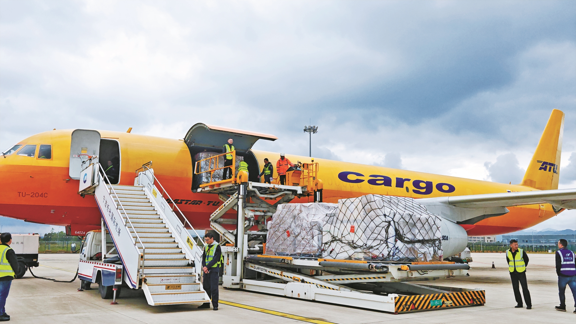 昨天12时58分,一架载着26吨电子配件、电脑、手机等“浙江制造”产品的全货机,从宁波栎社国际机场起飞,奔赴俄罗斯莫斯科。这标志着宁波首条直飞俄罗斯的全货机定班航线开通,一条高效的“空中商贸新走廊”就此贯通。该航线计划在每周的周二、周五执飞,由俄罗斯航星航空公司的TU204C全货机执飞、北京德沅国际货运代理有限公司运营。图为全货机正在装运货物。(王嘉彬 蒋钦卿 陈燕 摄)