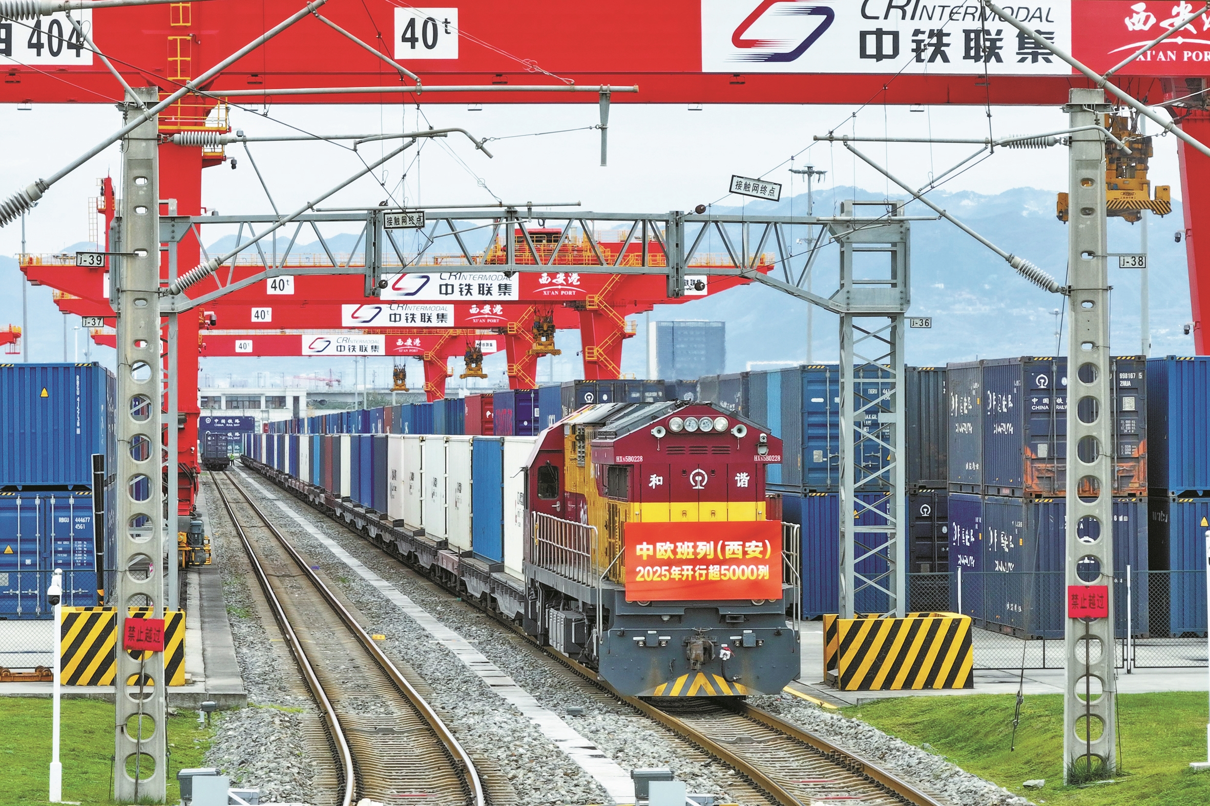 根据国铁集团提供的数据显示,2025年1月至10月,中欧班列(西安)累计开行5063列,同比增长16.3%,首次实现年度前10个月开行量突破5000列大关,创历年同期最高纪录。图为11月17日X9043次中欧班列(西安)驶出西安国际港站(无人机照片)。 (新华社记者 邵瑞 摄)