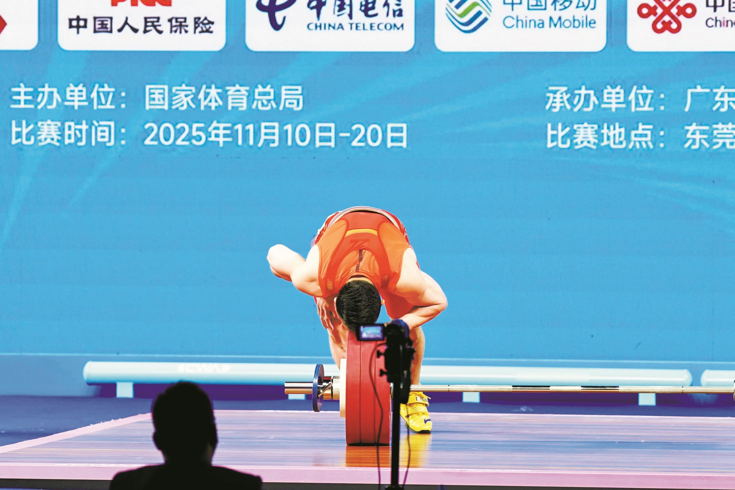此时,排名第二的湖南选手彭政林两次挑战192公斤失败,石智勇凭借346公斤的总成绩锁定冠军。