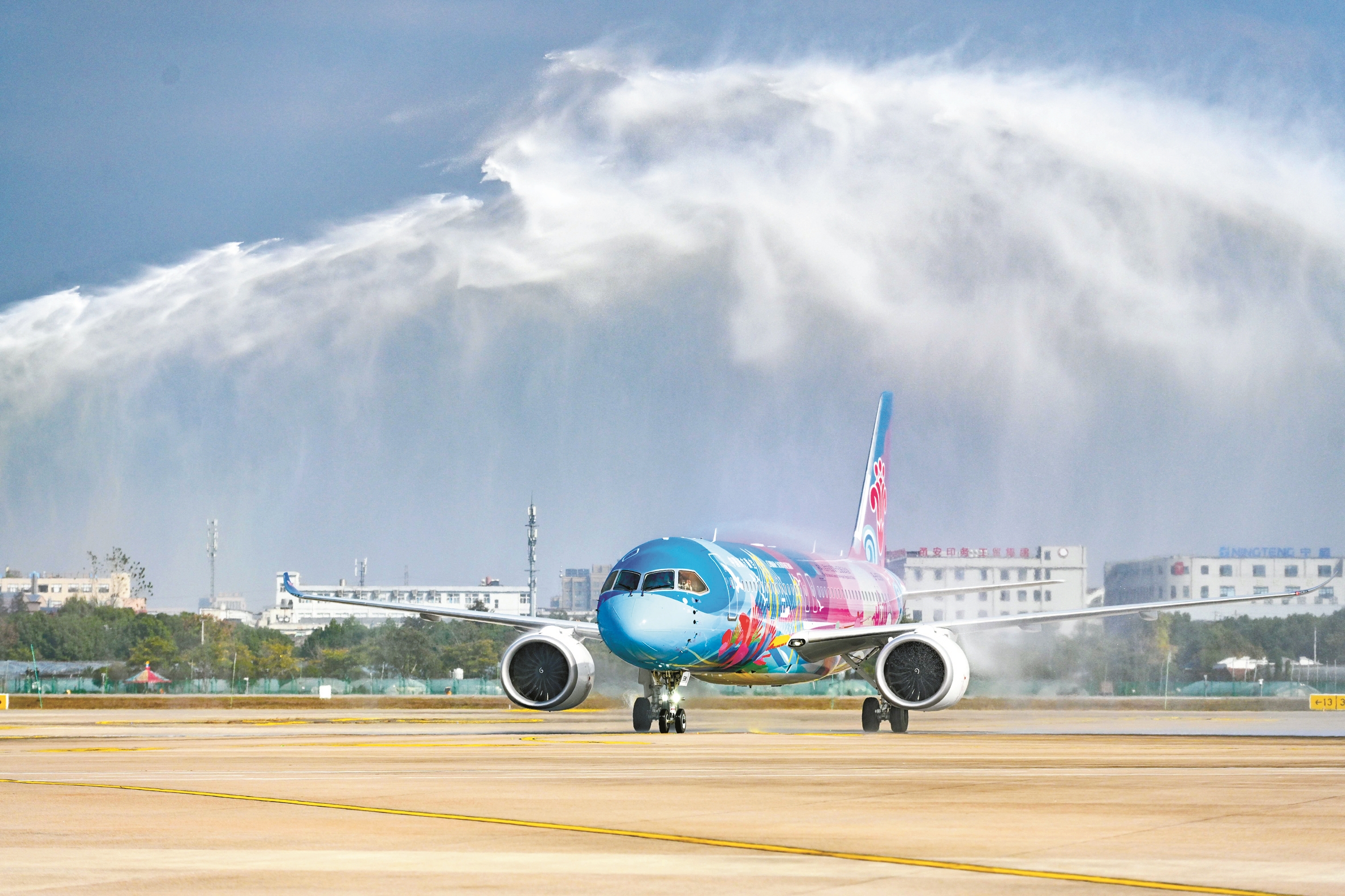 昨日10时24分,搭载162名旅客、由C919国产大飞机执飞的CZ3777航班平稳降落在宁波栎社国际机场。这架十五运“大美湾区”彩绘机,缓缓滑行穿过象征民航界最高礼遇的“水门”。据了解,这是南航国产大飞机C919首次投入宁波至广州航线运营,让国产大客机的通达网络继续扩大。初期,宁波至广州航线每天上下午各有一班安排C919执飞。(王嘉彬 蒋钦卿 戴如娟 摄)