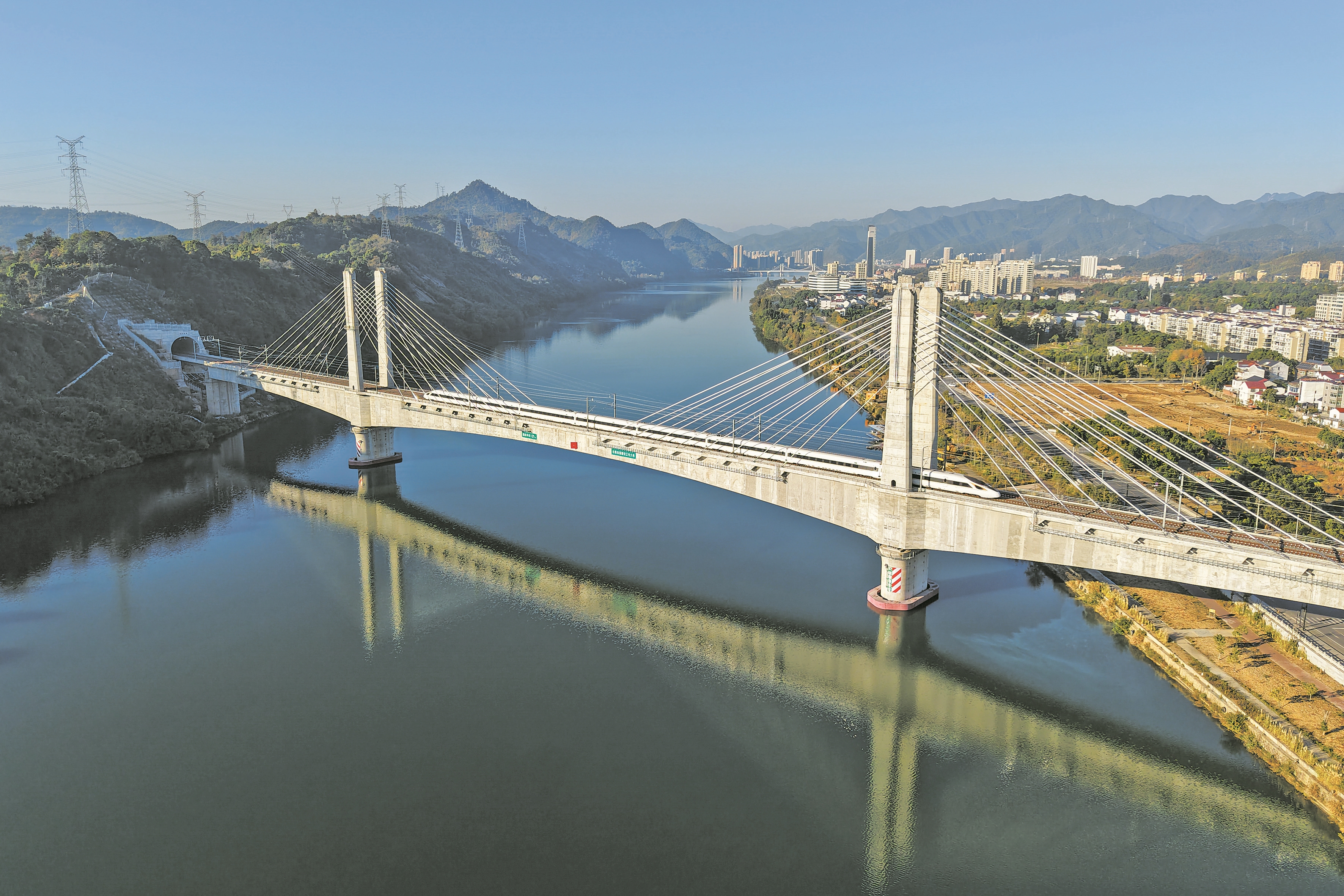 11月20日,首趟试运行列车G55611次从建德站开出,沿着新建杭州至衢州高速铁路驶向江山站方向,进行列车运行图参数测试,标志着杭衢高铁建设进入试运行阶段,预计12月底具备开通运营条件。图为列车行驶在杭衢高铁新安江特大桥上(无人机照片)。