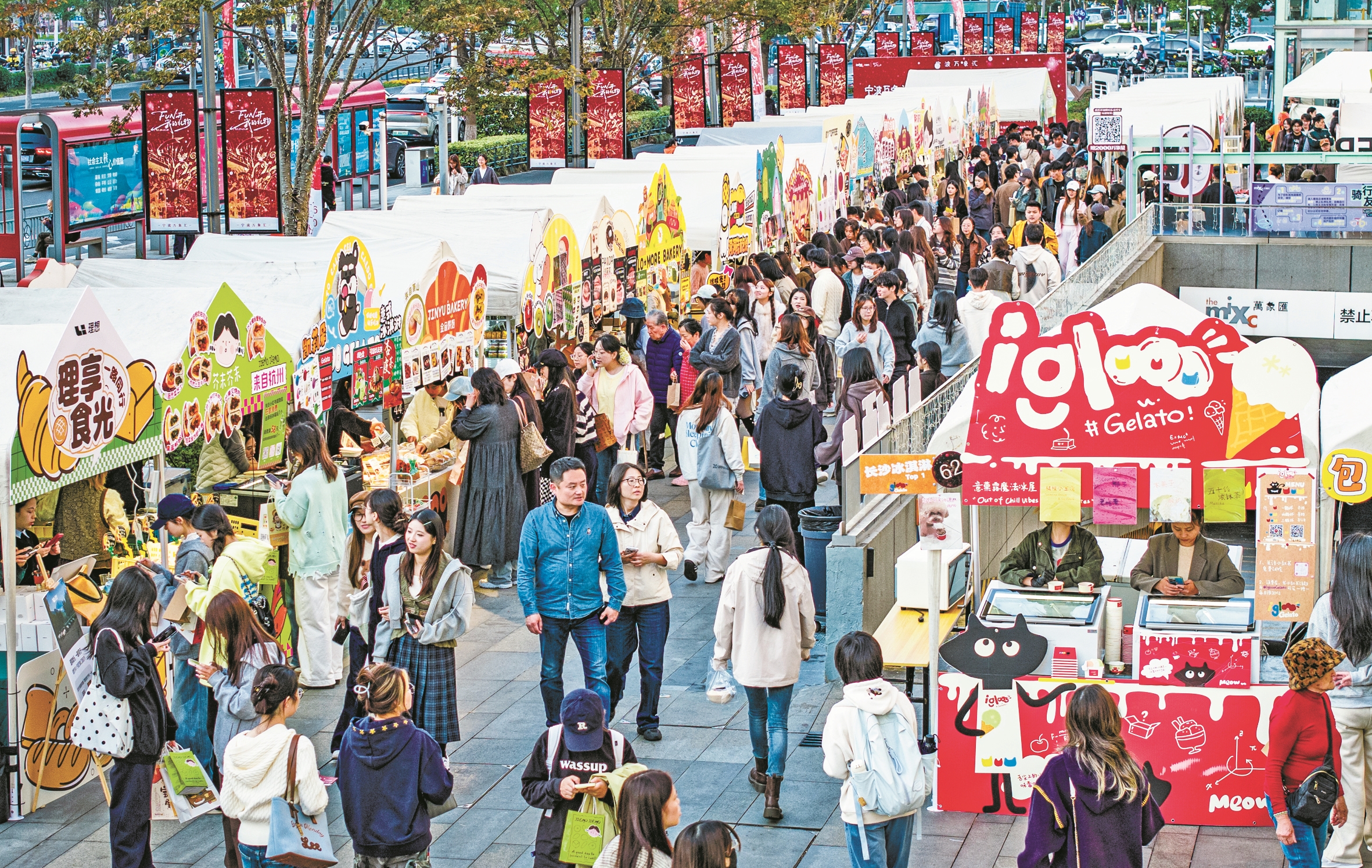 “文化+旅游”让风景里装满故事。鄞州深挖历史人文底蕴,打造“钱湖十二雅境”体验区,将东钱湖的湖光山色与千年文脉相融合,实现自然景观与人文内涵的双向赋能;酷乐潮玩的顶流IP“豚豚崽”凭借可爱造型与潮流属性,成为年轻潮人的“团宠”,更成为鄞州文旅的鲜活名片。如今的鄞州,文化旅游新业态蓬勃发展,IPN渔轮厂作为全省唯一入选商务部首批服务消费场景实践案例的项目,以工业遗存活化利用为特色,成为文旅消费新地标;宁波文化广场、宁波南部商务区水街成功创建省级夜间文旅消费集聚区,集盒文旅夜市、橙邑集市等4家市集入选省重点培育文旅市集名单,各项指标均位居全市第一。