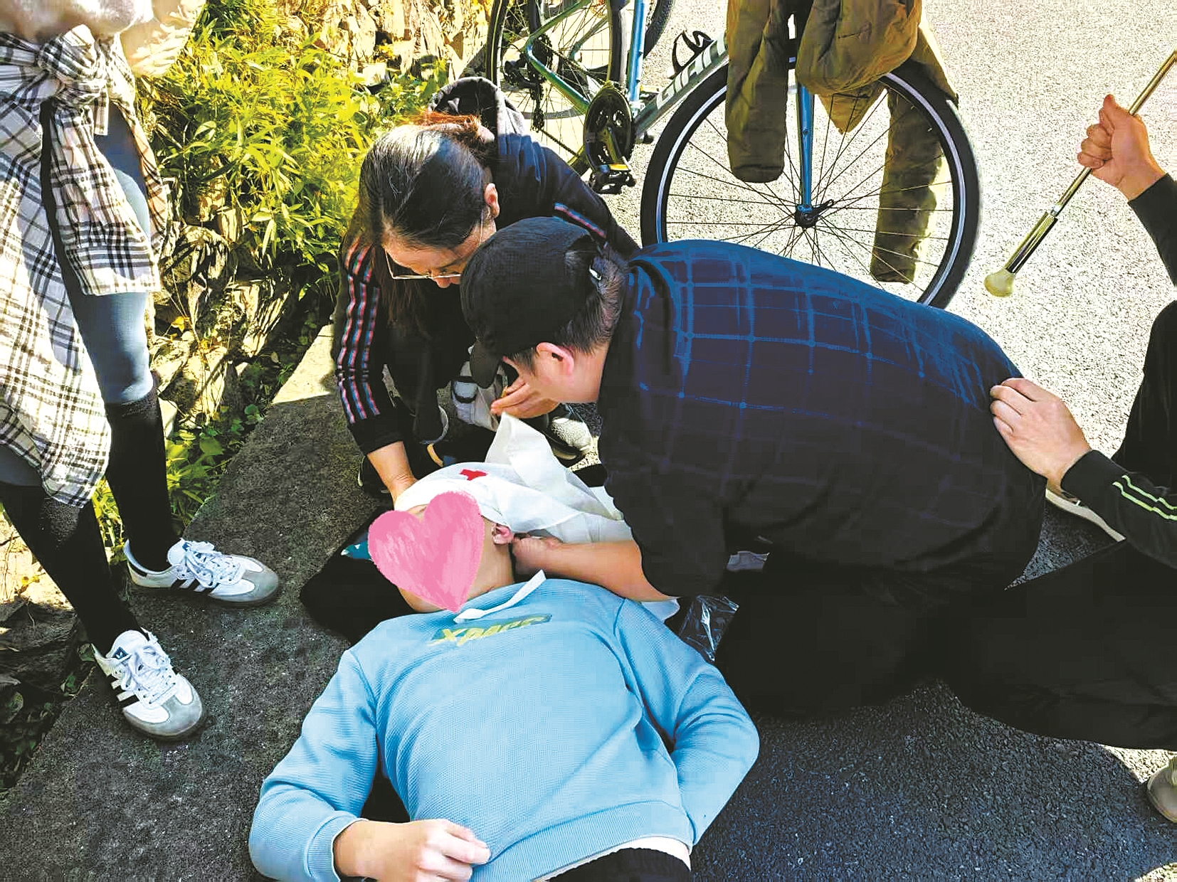 “大家让一让,我是医生,我们俩都是救护员!”路过的陈金委、宋珂迪夫妇立刻停车,拎起随车携带的急救包,冲上前去。