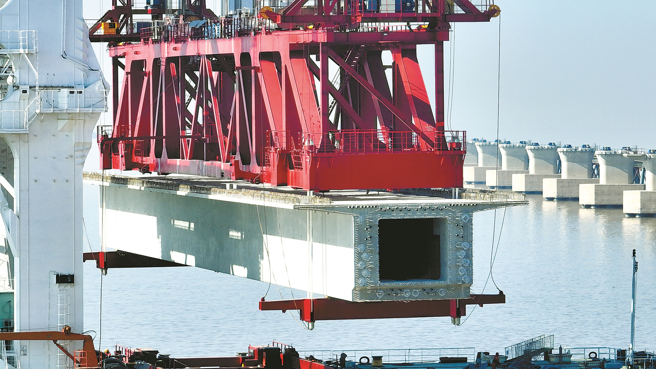 继杭州湾跨海铁路大桥嘉兴侧于9月底启动架梁,昨日,宁波侧也启动了首孔箱梁架设。该箱梁长78.5米、高5.4米,整体重2804吨,刷新世界纪录,是新一代“世界梁王”。随着宁波侧架梁施工的展开,南北两侧同步推进,大桥建设全面提速。